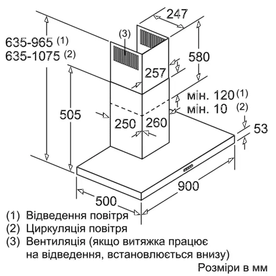 * Розміри приладу, монтаж для роботи в режимі відведення повітря (ВxШxГ) 635-965 x 900 x 500 мм