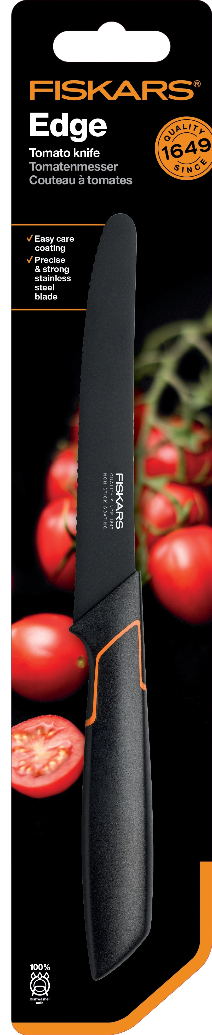Ніж для томатів Fiskars підходить для нарізки овочів або фруктів з різною структурою – з твердою шкіркою та м'якою серединою: помідор, огірок, апельсин, лимон тощо. Хвилясте лезо довше тримає заточку та підійде для нарізування хлібобулочних виробів, ковбаси, сиру.
