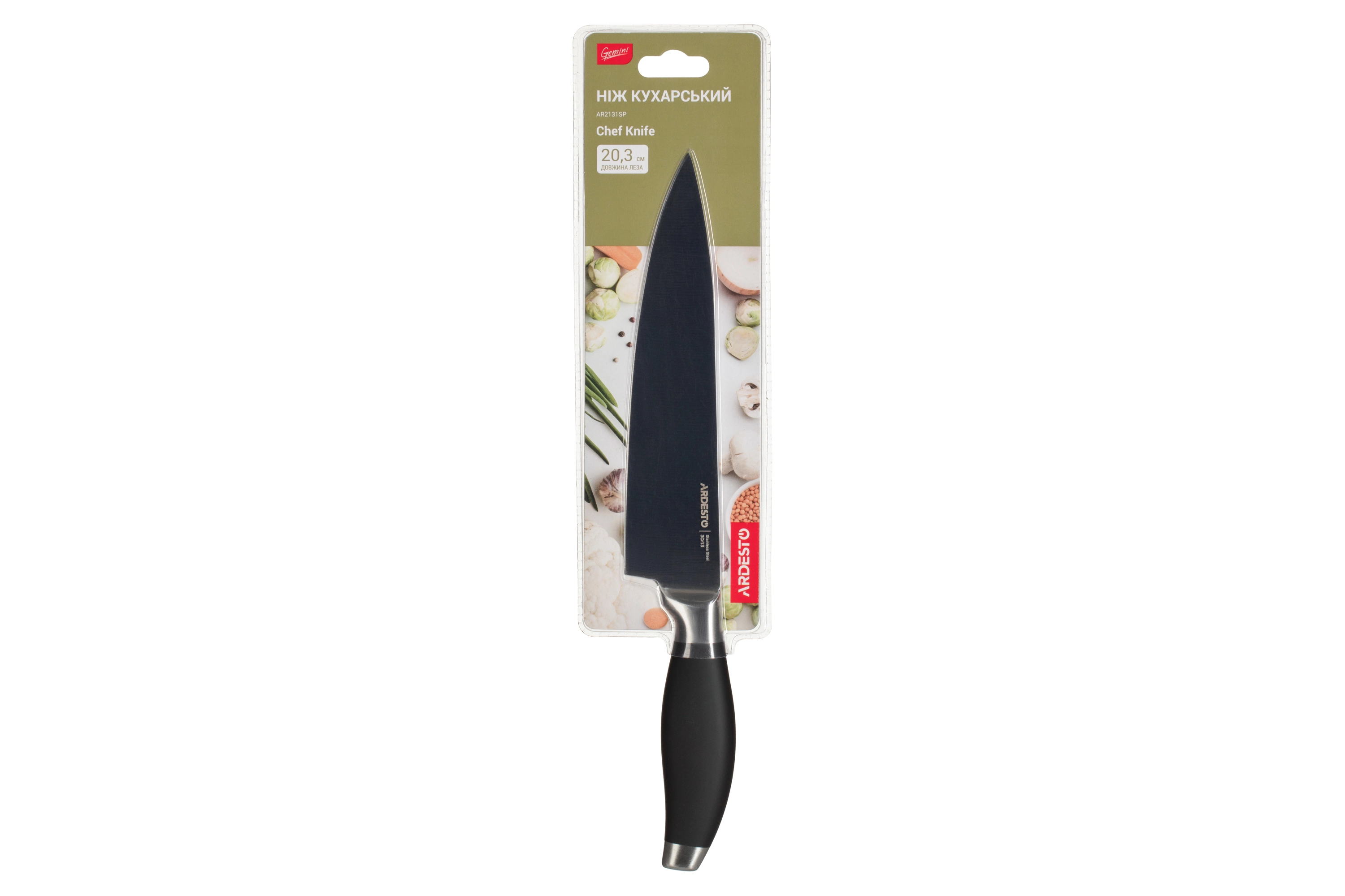 Кухонний ніж кухарський Gemini AR2131SP. Лезо ножа виготовлено з нержавіючої сталі 3CR13, а ручка з міцного пластику.