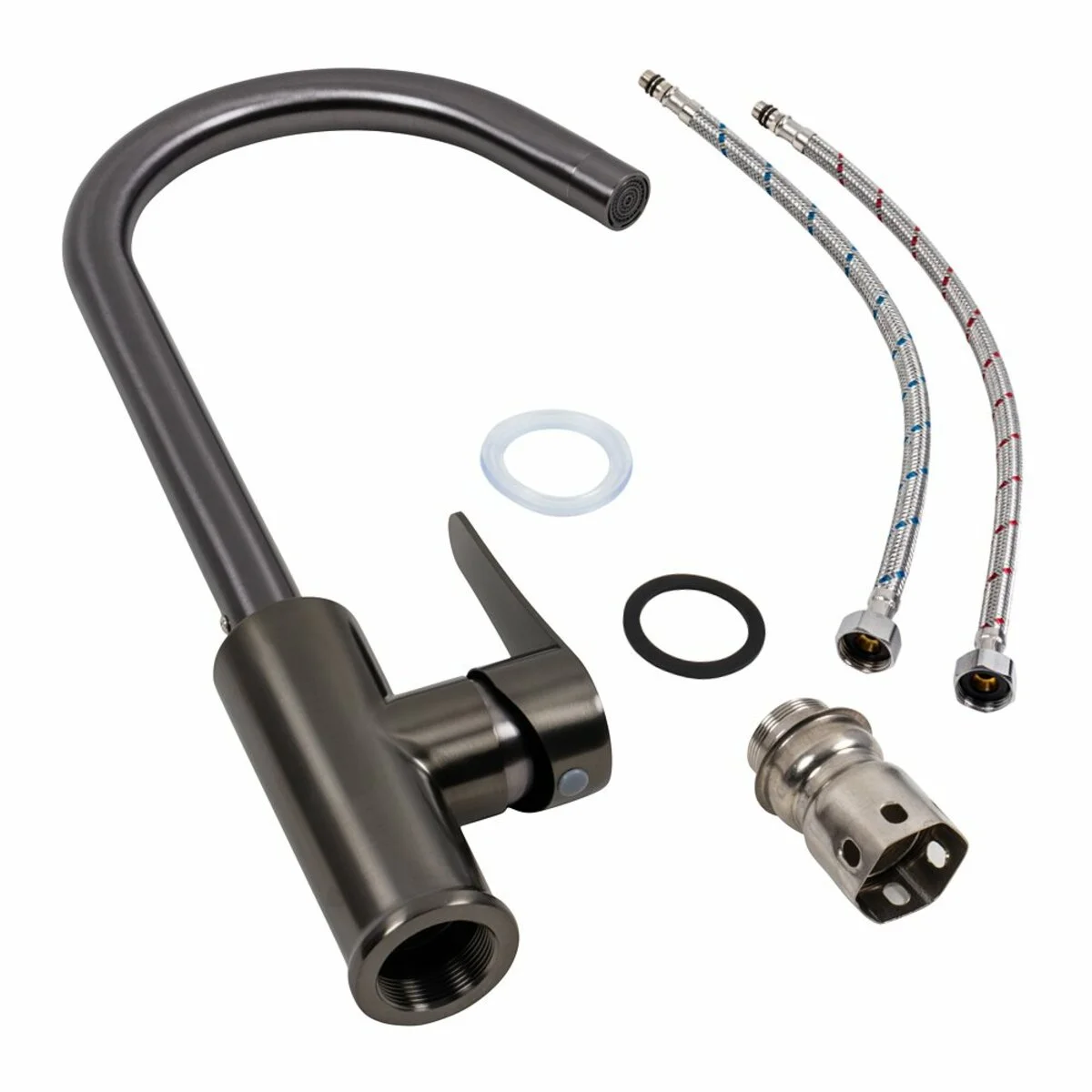 Чорний графітовий колір додає елегантності й гармонійно доповнює будь-який кухонний інтер’єр, а оптимальні розміри роблять цей змішувач ідеальним для будь-яких мийок.