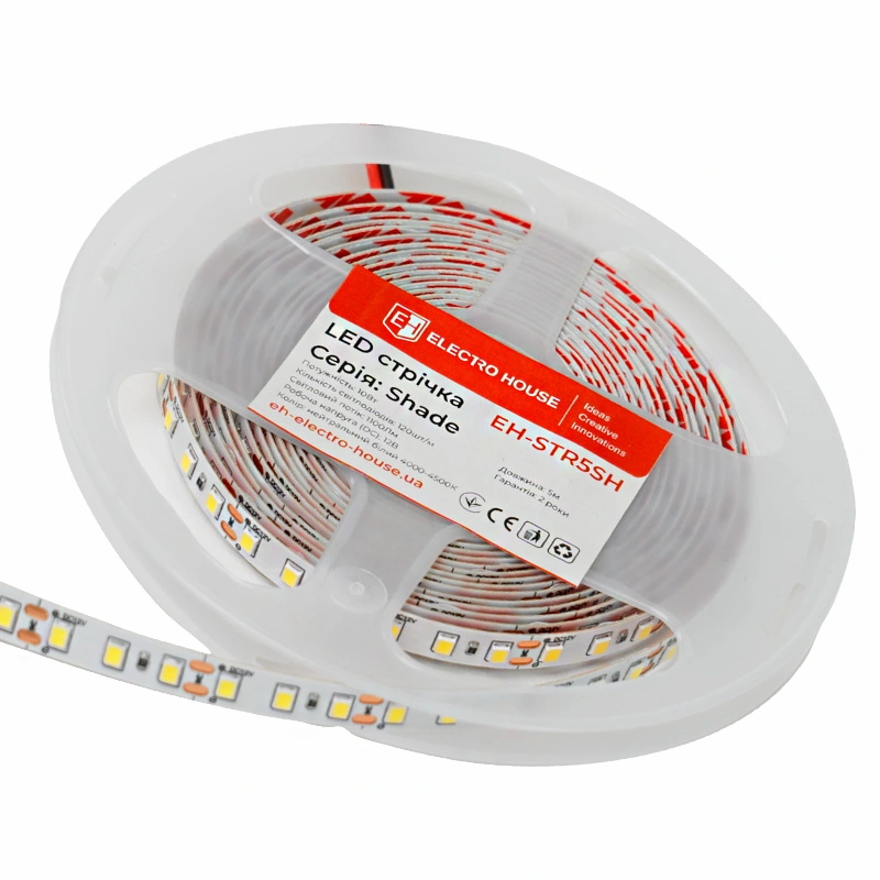 LED лента 10Вт 12В 1100 Лм, SMD2835 120 диодов, нейтральный белый 4500K, серия Shade, гарантия 2 года EH-STR5SH бренда ElectroSpace подходит для организации дополнительного освещения, создания световых акцентов, подсветки мебели и предметов интерьера. Также ее можно применять для создания дизайнерских светильников и других целей. Светодиодная лента этой модели должна использоваться в помещениях с нормальным уровнем влажности и запыленности. Рекомендуем использовать совместно с анодированным алюминиевым профилем и матовым рассеивателем. Профиль подбирается с учетом специфики эксплуатации и позволяет существенно увеличить время безотказной работы LED ленты, а также превращает ее в полноценный светильник. Лента EH-STR5SH легко и надежно монтируется на поверхность благодаря клейкому слою 3м, имеет разметку для точного разрезания, содержит 120 диодов на метр, рассчитана на напряжение 12В, цвет свечения нейтральный белый. Имеет длительную гарантию - 2 года. Це оптимальний вибір для вирішення широкого спектра завдань дизайну та організації освітлення. *Ціна вказана за 1 метр. *Ця світлодіодна стрічка продається кратно п'яти метрам.