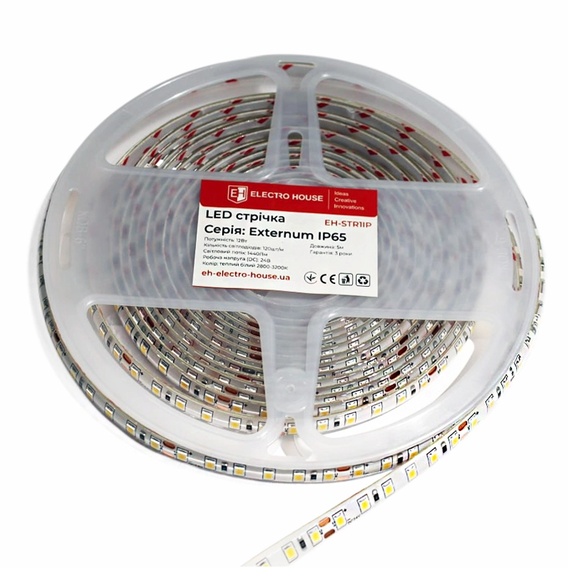 <Светодиодные ленты серии Externum IP65 отличаются высокой яркостью и равномерностью освещения благодаря высокой плотности светодиодов. LED лента содержит 120 диодов на метр. Ее можно использовать в помещениях с повышенной влажностью, запыленностью или вне помещений. Лента помещена в водонепроницаемую основу из прозрачного силикона и имеет степень защиты IP65. На обратную сторону нанесен качественный двусторонний скотч 3М для надежного монтажа на поверхность. Она используется для решения самых разнообразных задач интерьерного и экстерьерного дизайна, для создания уличной рекламы и организации основного освещения. Это создание световых акцентов на различных архитектурных объектах и их подсветка, подсветка витрин, стеллажей, мебели, зеркал, ступенек, рекламные световые надписи и конструкции, подсветка для автомобиля, подсветка или основное освещение в ванной комнате или другом помещении с повышенной влажностью. Вариантов применения светодиодной ленты EH-STR1IP гораздо больше, и они ограничены только Вашей фантазией. LED лента 12Вт 24В SMD2835 120 диодов, теплый белый 2800К, серия Externum IP65 , гарантия 3 года бренда ElectroSpace принадлежит к премиум-классу, отличается долговечностью и имеет гарантию 3 года. Все электрические соединения при эксплуатации вне помещения или в помещении с повышенной влажностью должны быть хорошо изолированы и защищены от внешних неблагоприятных воздействий, а сама светодиодная лента защищена от прямого попадания воды. Потрібно уникати безпосереднього занурення вироби в воду. Можна використовувати алюмінієвий профіль для додаткового захисту та ефективного охолодження, це істотно збільшує термін експлуатації й дозволяє організувати світлове акцентування або створювати різноманітні світлові ефекти. Варто приділити увагу підбору блоку живлення - для експлуатації при підвищеній вологості він повинен бути герметичним, тобто мати клас захисту не нижче IP65 і мати запас потужності не менше 20%, бажано, щоб запас був більше. *Ціна вказана за 1 метр. *Ця світлодіодна стрічка продається кратно п'яти метрам.