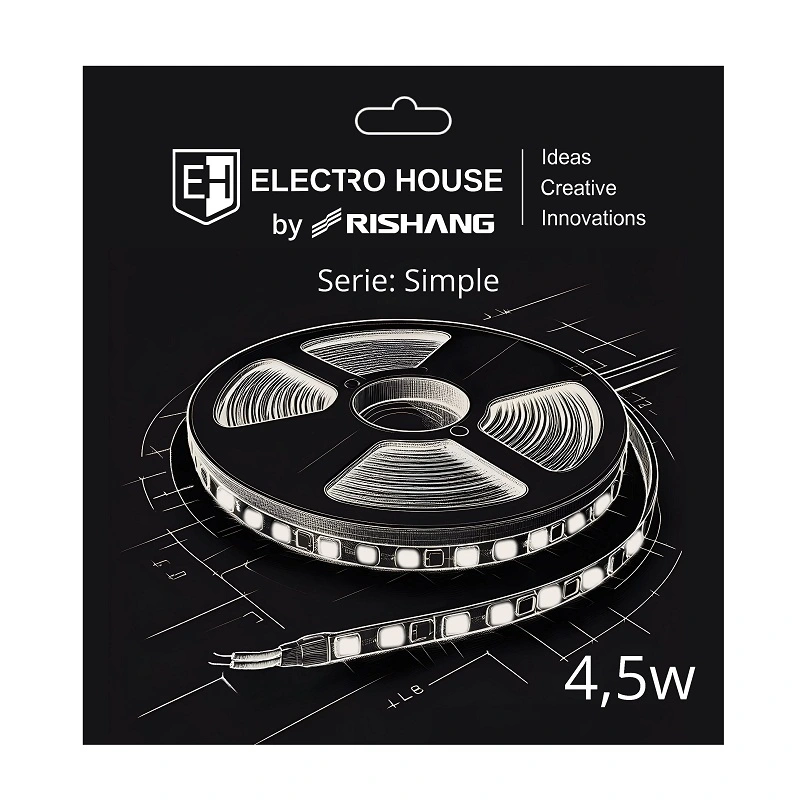 LED лента 4,5Вт 12В SMD2835 60 диодов, 540 Лм, теплый белый 3000K, серия Simple ElectroSpace by Rishang EH-STR1RS12 - это идеальное решение для тех, кто ищет качественное, энергоэффективное и удобное в использовании освещение. Эта LED лента сочетает в себе простоту установки и высокую надежность, что делает ее отличным выбором для декоративной подсветки различных помещений.