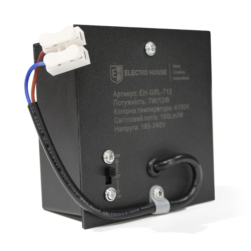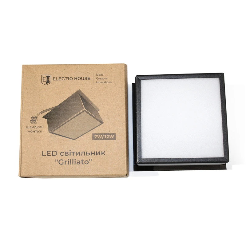LED светильник Grilliato черный, 7Вт/12Вт, 4100К, нейтральный белый, 100 Лм. EH-GRL-712 – это современное решение для освещения коммерческих и офисных помещений. Благодаря компактным размерам (100 × 100 мм) и стильному черному корпусу, он идеально вписывается в любой интерьер с подвесным потолком типа Грильято.