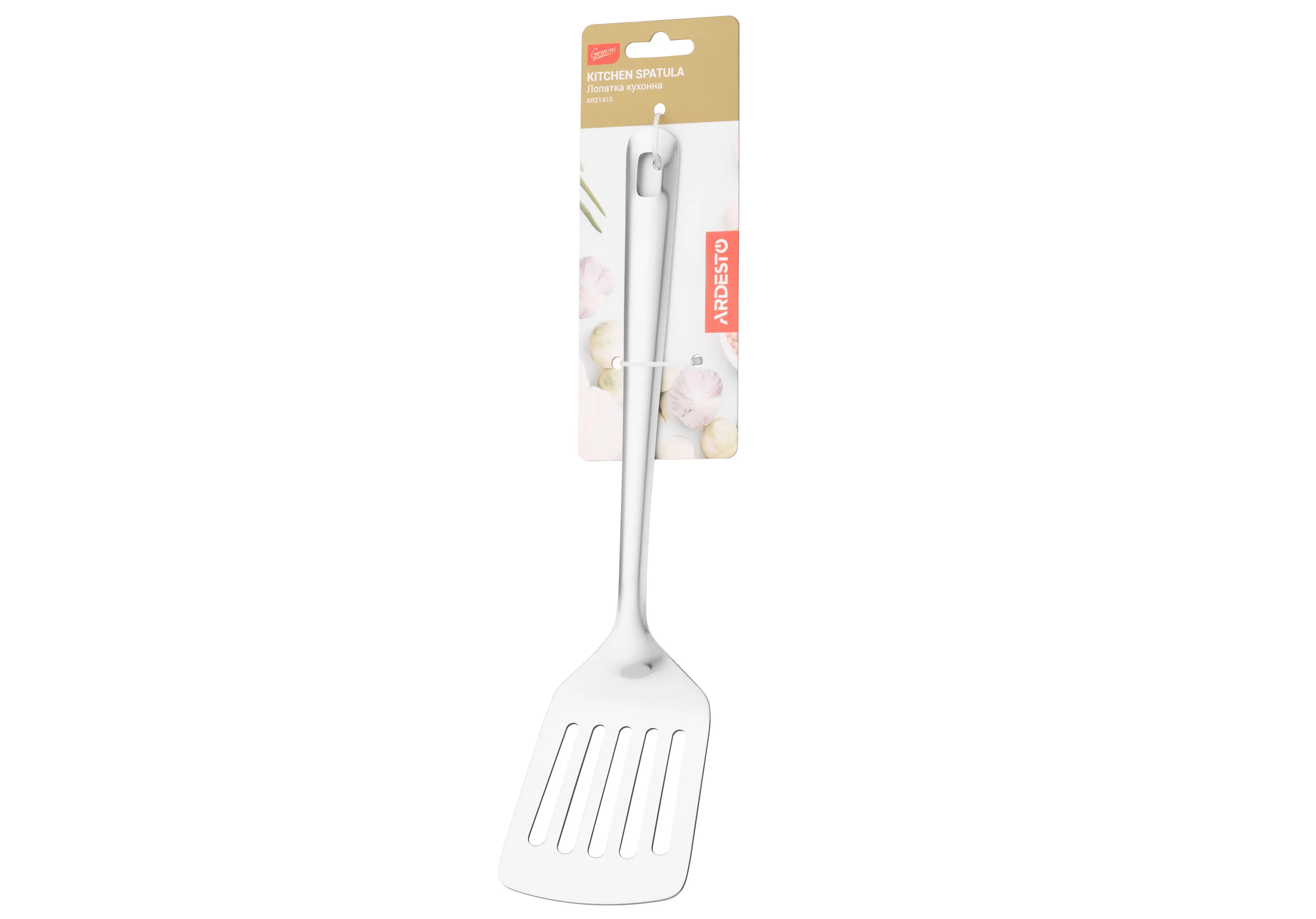 Лопатка ARDESTO Gemini виготовлена з нержавіючої сталі. Міцне руків’я з зручно лягає в руку та має отвір для підвішування. Виріб можна мити в посудомийній машині.
