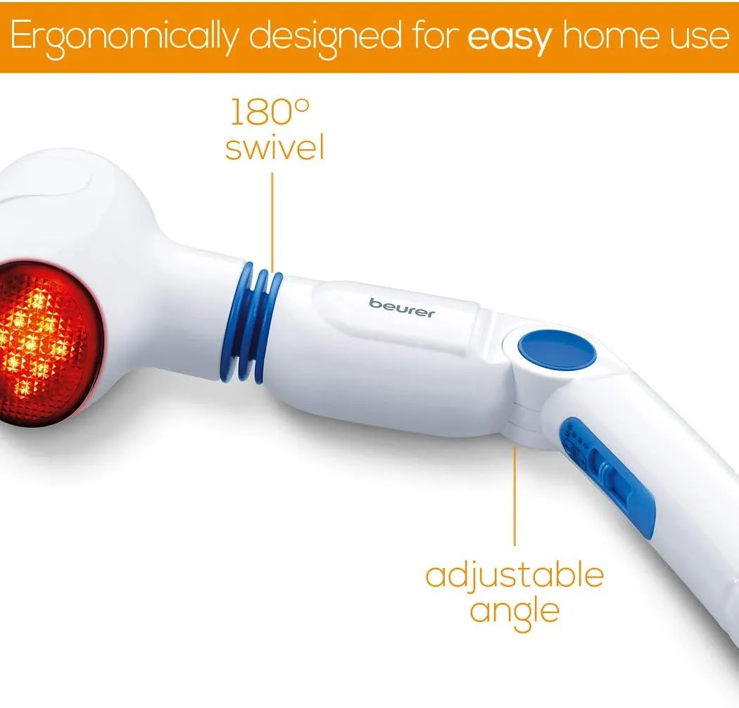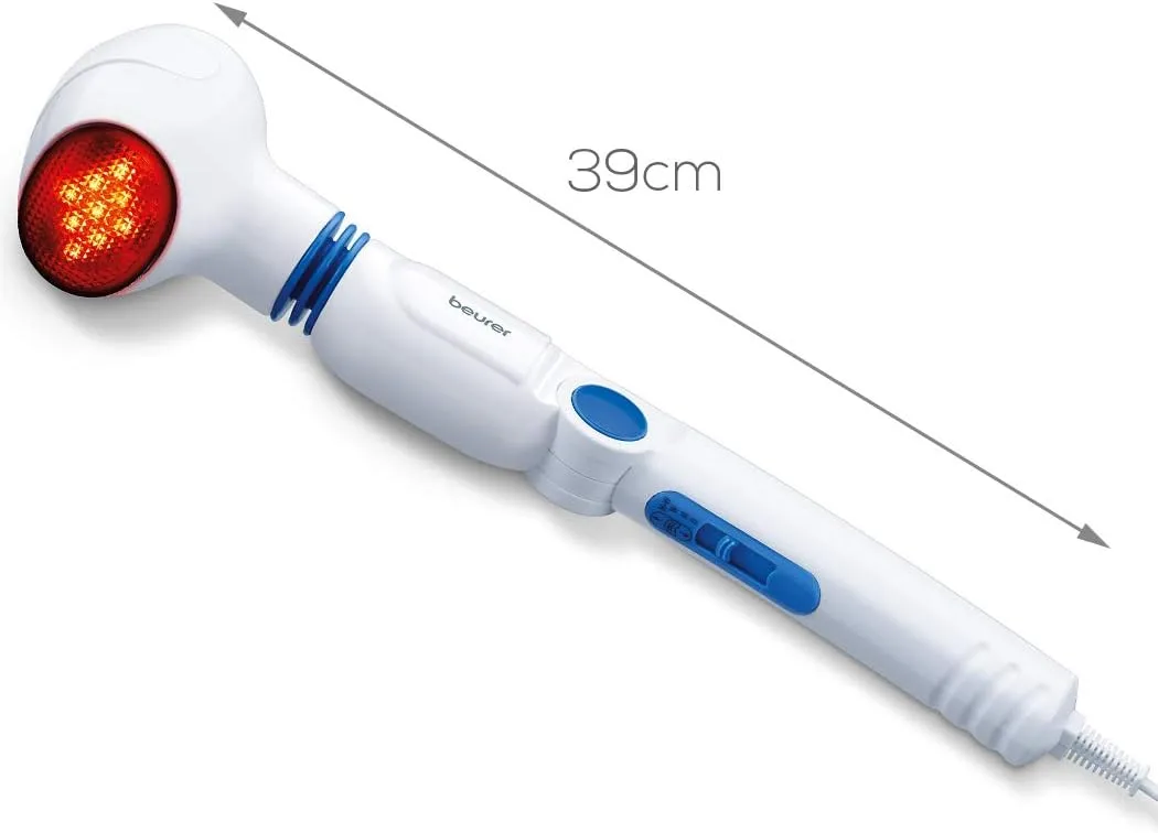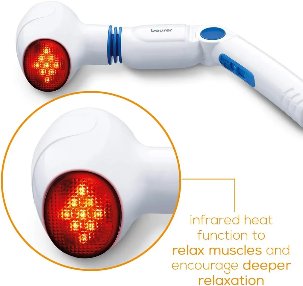 Інфрачервоний масажер Beurer MG40 має насадку, що обертається, яка дозволяє легко досягати всіх частин тіла. Вібруюча масажна головка забезпечує заспокійливий і розслабляючий масаж. Для забезпечення додаткової універсальності пристрій поставляється з чотирма змінними насадками, одна з яких має рефлексотерапевтичні вузлики. Інтенсивність масажу можна регулювати на 3 рівнях. Крім того, застосування інфрачервоного тепла підсилює ефект масажу не тільки за рахунок прогрівання поверхні шкіри, але і за рахунок посилення кровообігу в цій зоні.