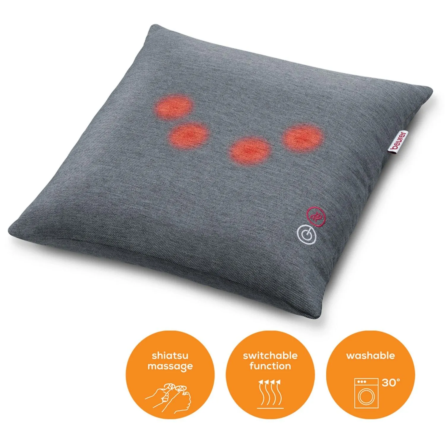 Масажна подушка Beurer для плечей, шиї, спини та ніг, від мережі, 4 головки шиацу, підігрів, сірий