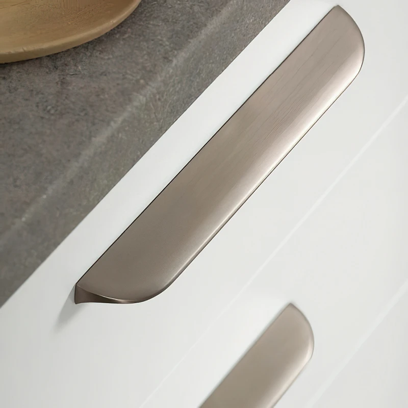 Елегантні ручки, які чудово вписуються до сучасної кухні, доступні у двох варіантах довжини та кольорах: матова латунь і нержавіюча сталь.