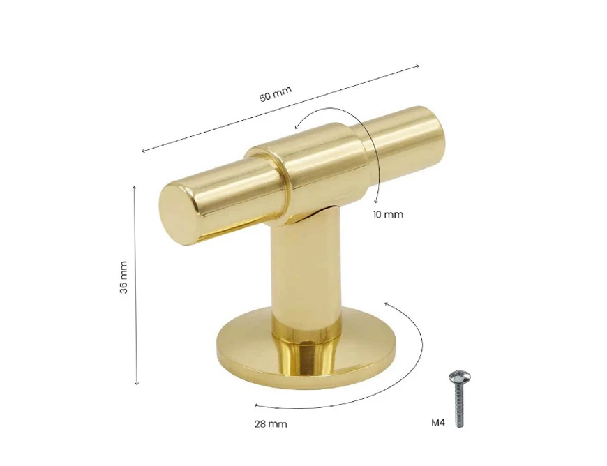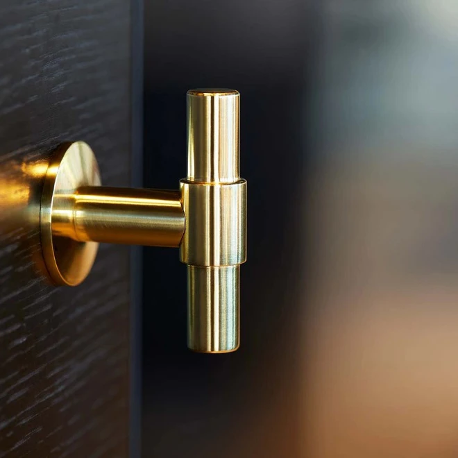 Т-образная форма обеспечивает хорошее сцепление и идеально подходит для кухни, ванной комнаты или дверей шкафа. Ручка доступна в пяти цветах: матовая нержавеющая сталь, матовый черный, никель, латунь и необработанная латунь.