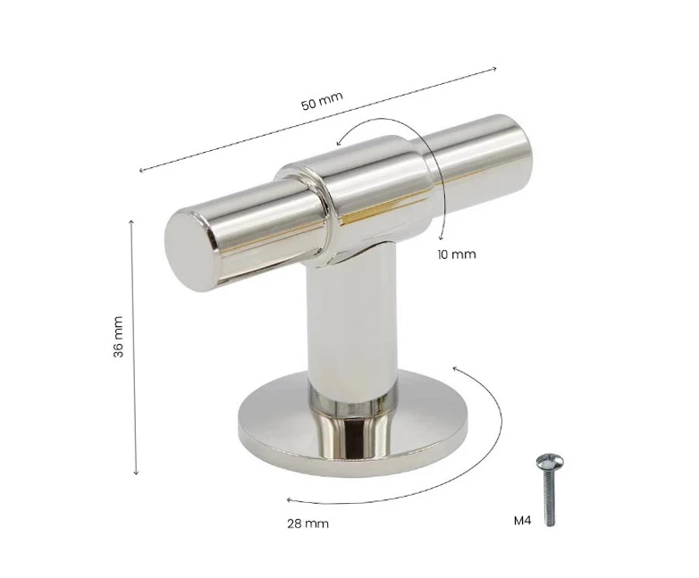 Т-образная форма обеспечивает хорошее сцепление и идеально подходит для кухни, ванной комнаты или дверей шкафа. Ручка доступна в пяти цветах: матовая нержавеющая сталь, матовый черный, никель, латунь и необработанная латунь.