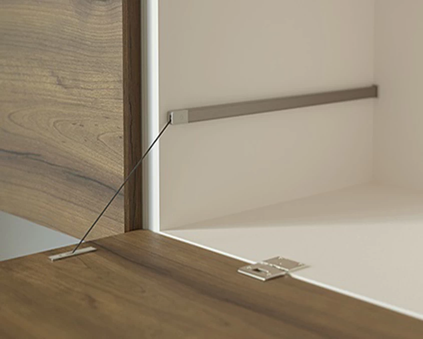 Система регулирует силу открывания, поэтому ее можно использовать с фасадами разного веса, а также корпусами разной глубины благодаря возможности подрезания троса и профиля.