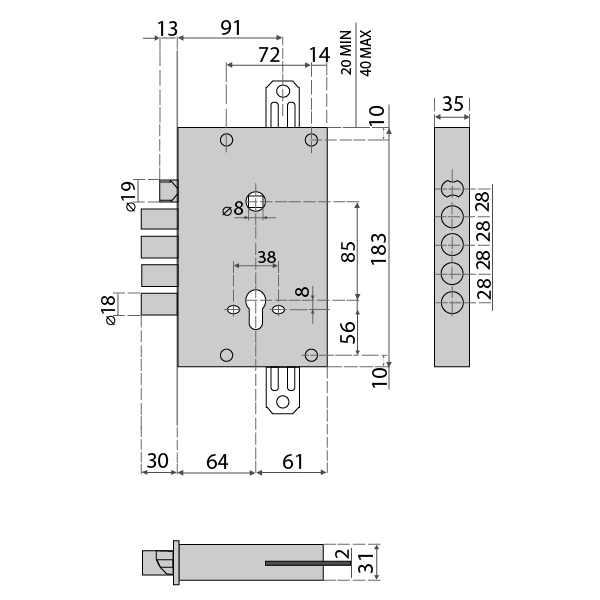 Даний циліндровий замок поєднує в собі високу міцність і чудову зламостійкість. Це робить його ідеальним для використання в якості основного – механізм керується за допомогою змінного циліндра та ручок. Серцевину можна окремо підібрати відповідно до вимог безпеки та рівня секретності. Додаткова засувка (язичок) із діаметром 19 мм додає до загальної надійності системи.