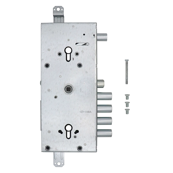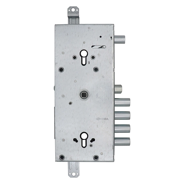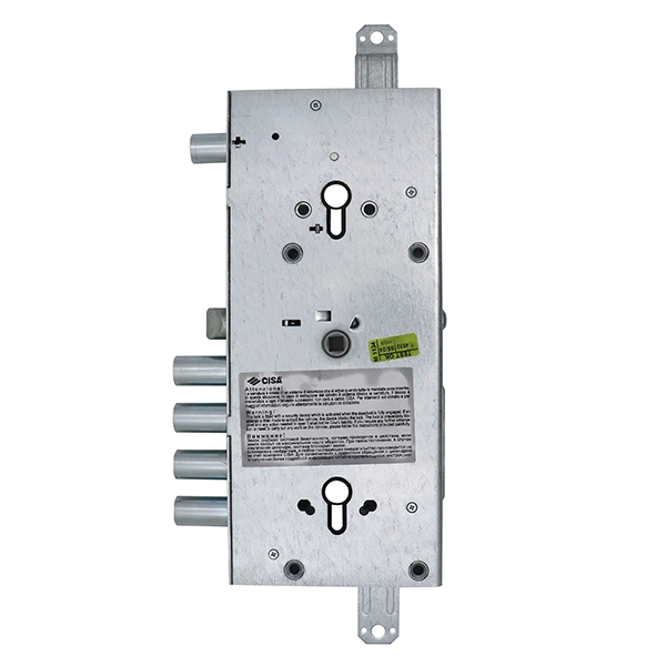 Замок CISA 56765 – це комбінований замок, закривання якого здійснюється двома серцевинами стандарту EURO DIN. Це посилює захисні властивості, тому його зазвичай майстри радять до встановлення в металеві двері посиленої конструкції. Замок 4-х ригельний, але має ще додатковий ригель, що керується верхнім циліндром. Він же блокує роботу основного нижнього механізму.