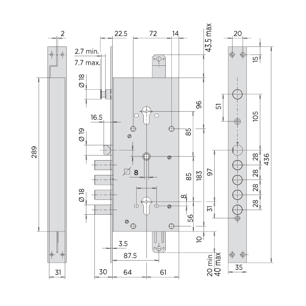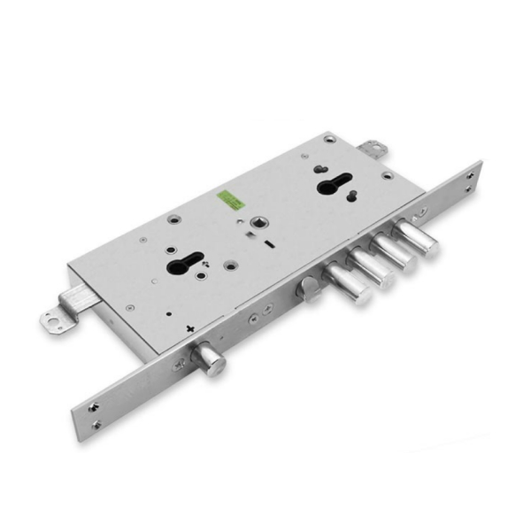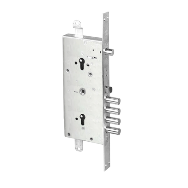 Замок 4-х ригельний, але має ще додатковий ригель, що керується верхнім циліндром. Також в конструкції передбачені провушини для кріплення тяг. Таким чином, замок може зачинятися в 3 сторони.