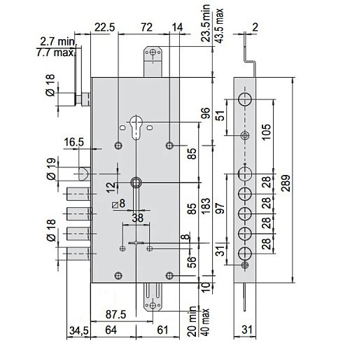 - Додатковий сталевий ригель, вихід – 22,5 мм.