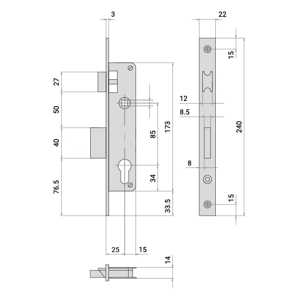 У відчиненому стані фіксується за допомогою язичка. Він реверсивний, тому замок можна встановити як у ліво, так і правосторонні дверні полотна. Замикання здійснюється одним прямокутним ригелем товщиною 8,5 мм.
