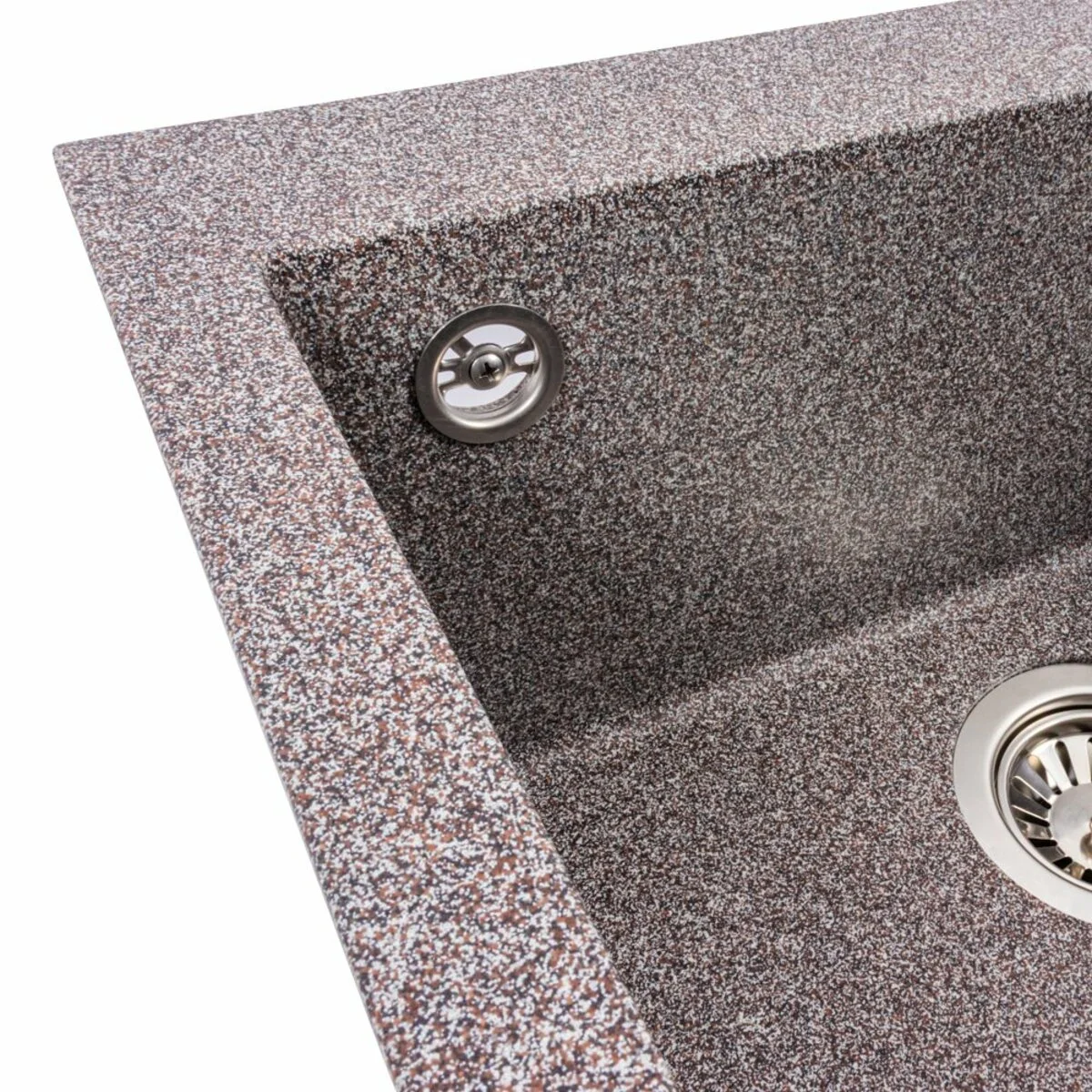 Мийка має компактні розміри 500×500 мм і глибоку чашу 200 мм, що забезпечує зручність у щоденному користуванні навіть у невеликих кухнях. Завдяки використанню якісного штучного каменю на основі гранітної крихти, виріб стійкий до подряпин, температур і агресивної побутової хімії.