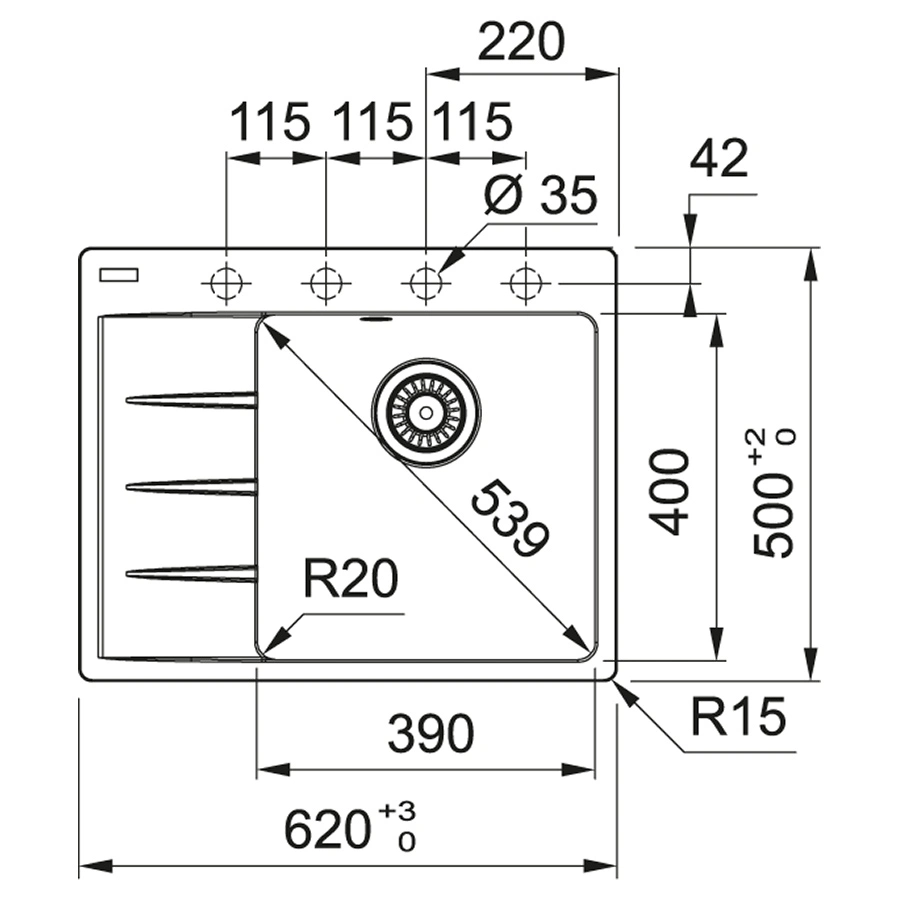 Мийка кухонна Franke Centro, фраграніт, прямокутник, з крилом, 620х500х200мм, чаша - 1, накладна, CN