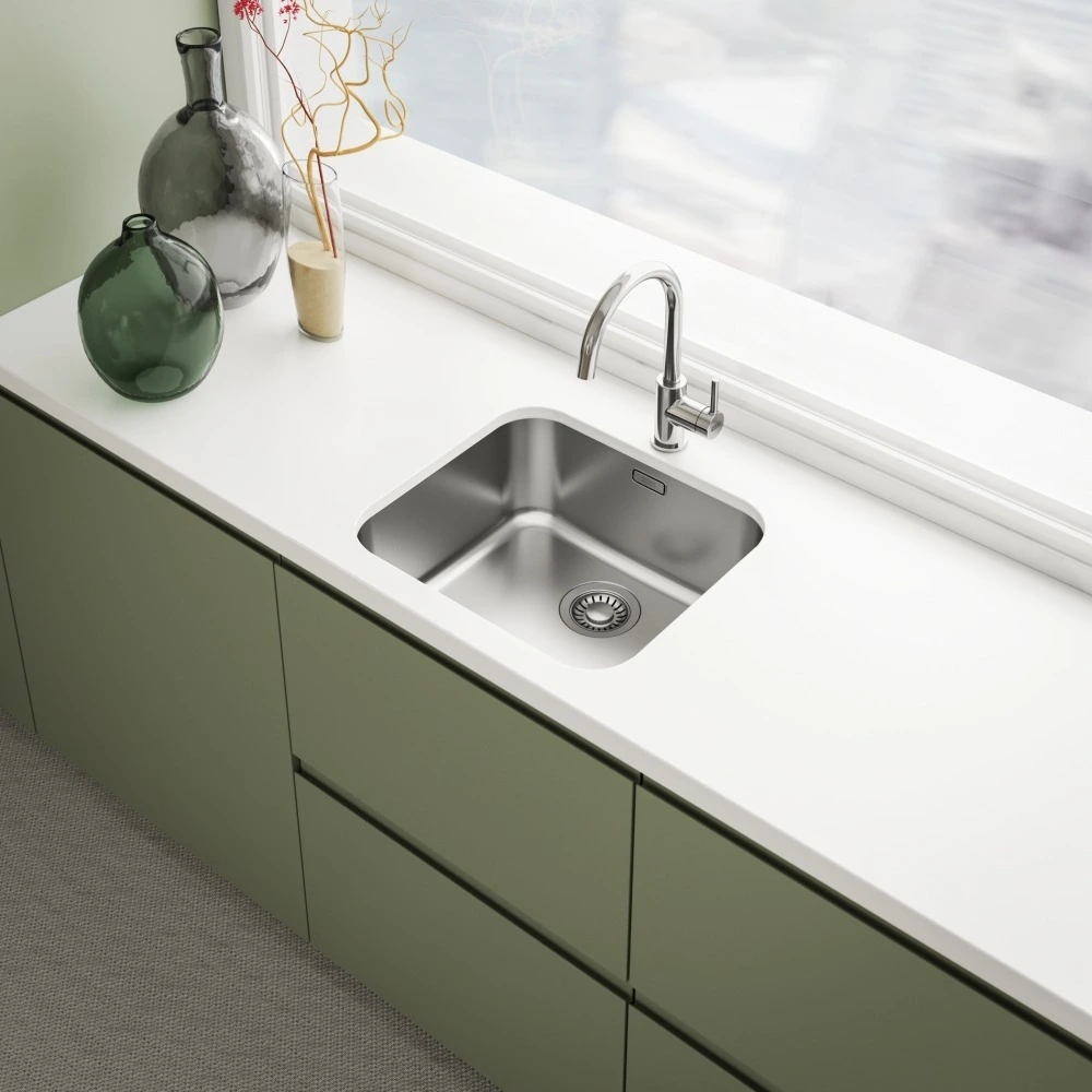 Мийка має сучасну і популярну конструкцію в формі чаші без крила. Таким чином максимально ефективно використовується місце на стільниці, а зона мийки має сучасний мінімалістичний вигляд. Для максимальної зручності та гігієни мийка монтується під стільницю, тому на робочій поверхні не буде місць, де назбирується забруднення. Змішувач та інші додаткові аксесуари монтуються на стільниці, завдяки чому ви маєте повну свободу в розміщенні та організації приладів, які поєднує мийка.