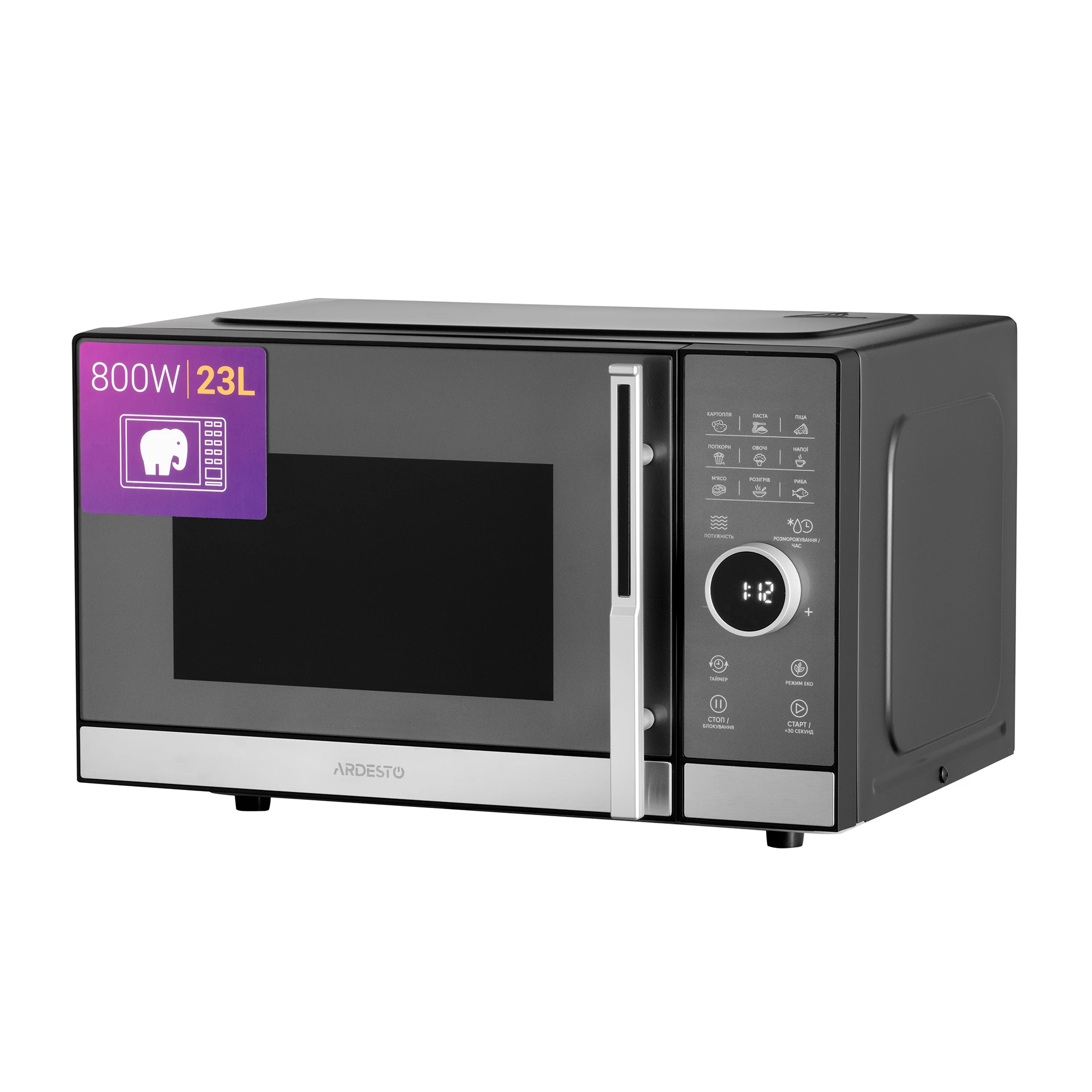 Мікрохвильова піч ARDESTO, 23л, електр.керув., 800Вт, дисплей, відкр.ручкою, чорний