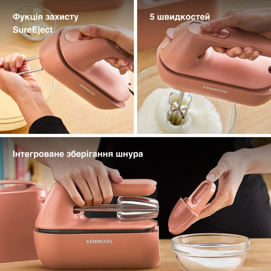 Оснащений тихим, але потужним двигуном 350 Вт, міксер забезпечує відмінні результати, зберігаючи компактний розмір. Кнопка для зняття насадок розташована на передній панелі, що запобігає випадковому натисканню.