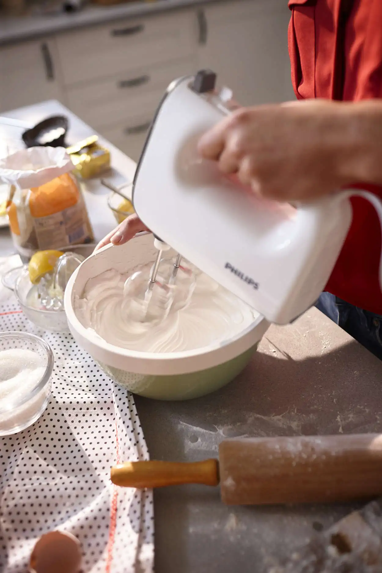 Міксер Philips допомагає випікати смачні пухкі торти та хліб для всієї сім’ї. Конічне змішування для насичення киснем дозволяє швидше збивати та змішувати однорідніше рідке тісто на торт. Його потужний двигун 450 Вт легко замісить навіть найгустіше тісто.