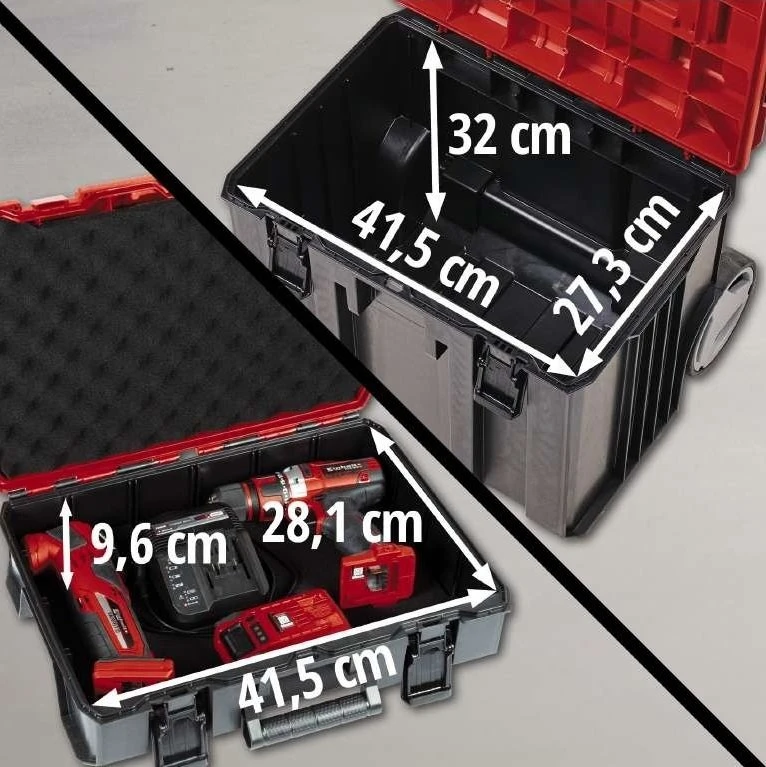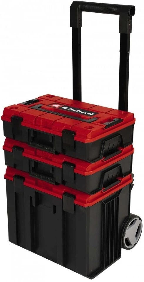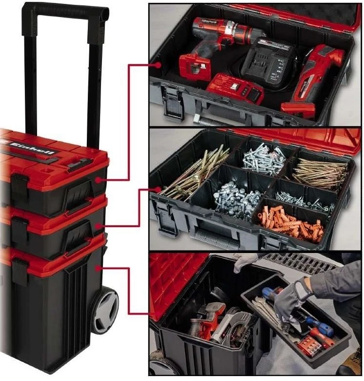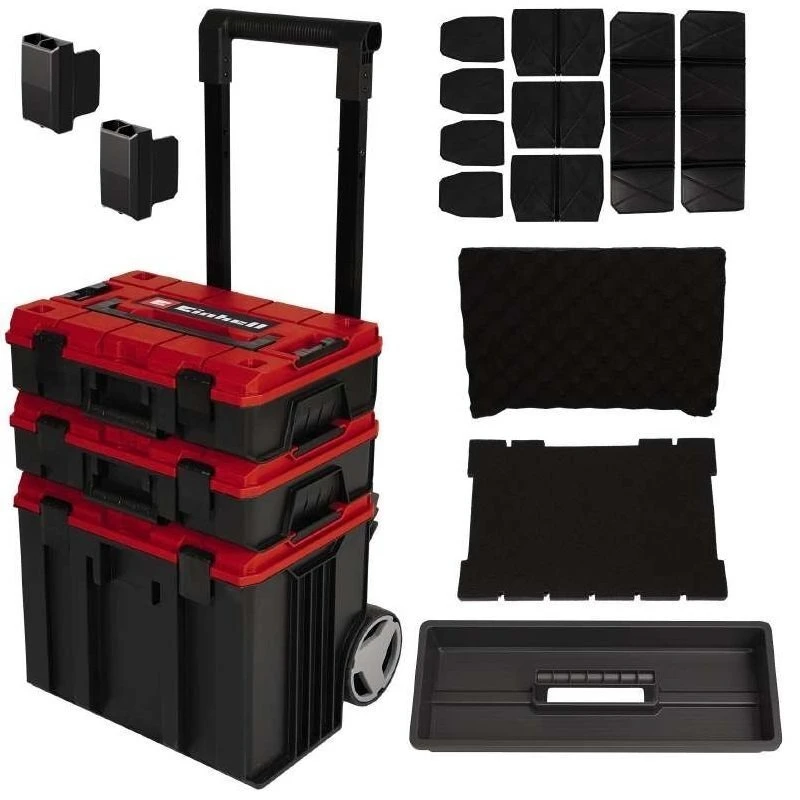 Einhell E-Case Tower є частиною модульної системи Einhell E-Case і ідеально підходить для зберігання та транспортування інструментів, аксесуарів та іншого обладнання. E-Case Tower складається з трьох кейсів: E-Case L містить зйомну вставку для ручних інструментів, один із двох кейсів E-Case S постачається з двома поролоновими вставками для безпечного транспортування без подряпин, а інший містить пластикові відсіки для впорядкованого транспортування дрібних деталей і аксесуарів.