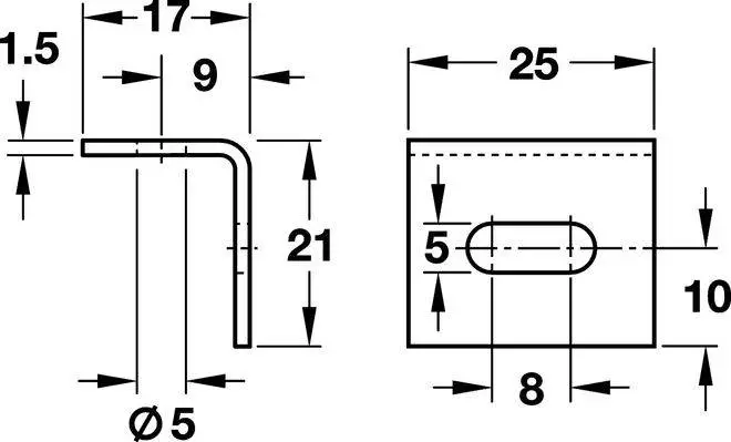 Монтажний кутник з поперечним пазом і 1 отвором , виготовлений з нікельованої сталі. Розміри кутника: ширина 21х17мм, довжина 25 мм.