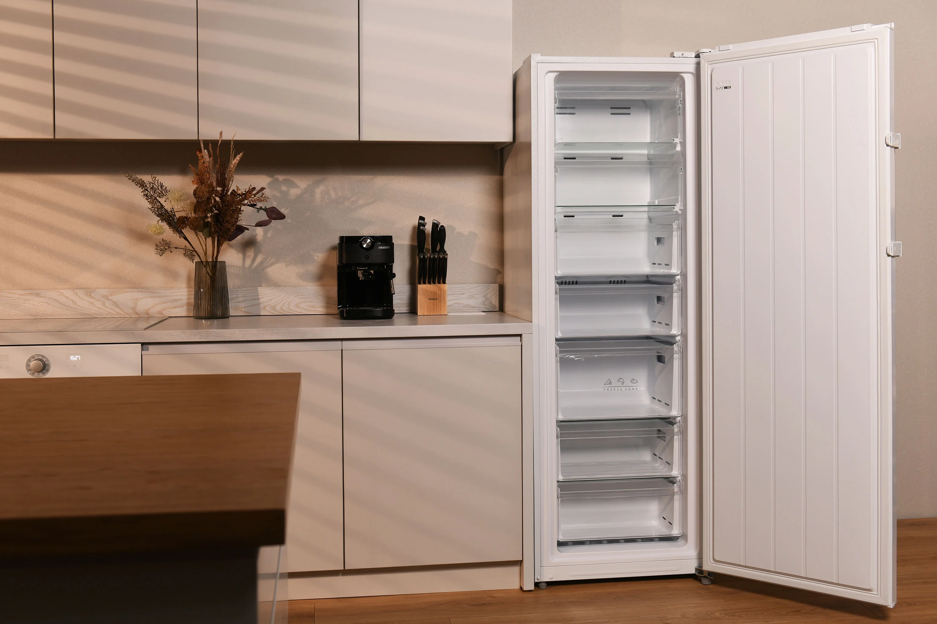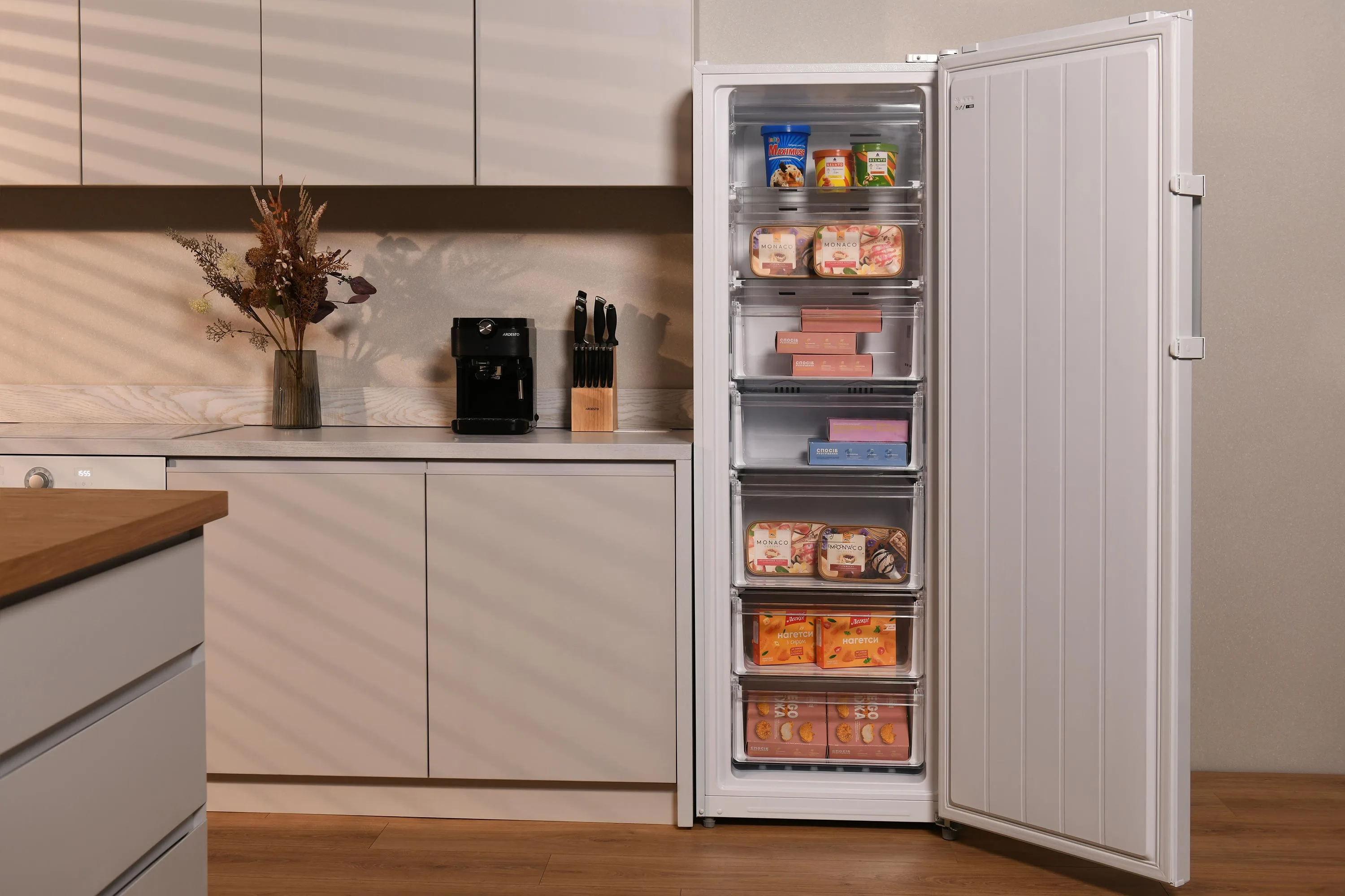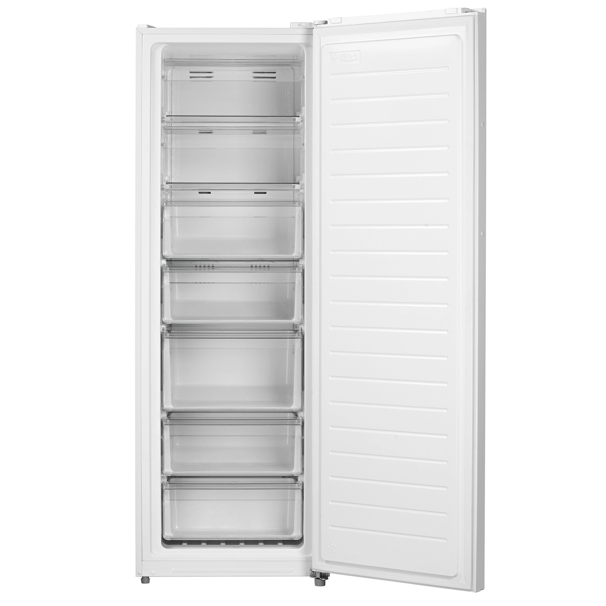 Містка вертикальна морозильна камера білого кольору з No Frost-охолодженням та можливістю роботи у режимі холодильника для домогосподарств та великих магазинів. Енергозбереження відповідає класу А+, для зберігання продуктів передбачено сім відсіків, а корисний об’єм складає 238 л.