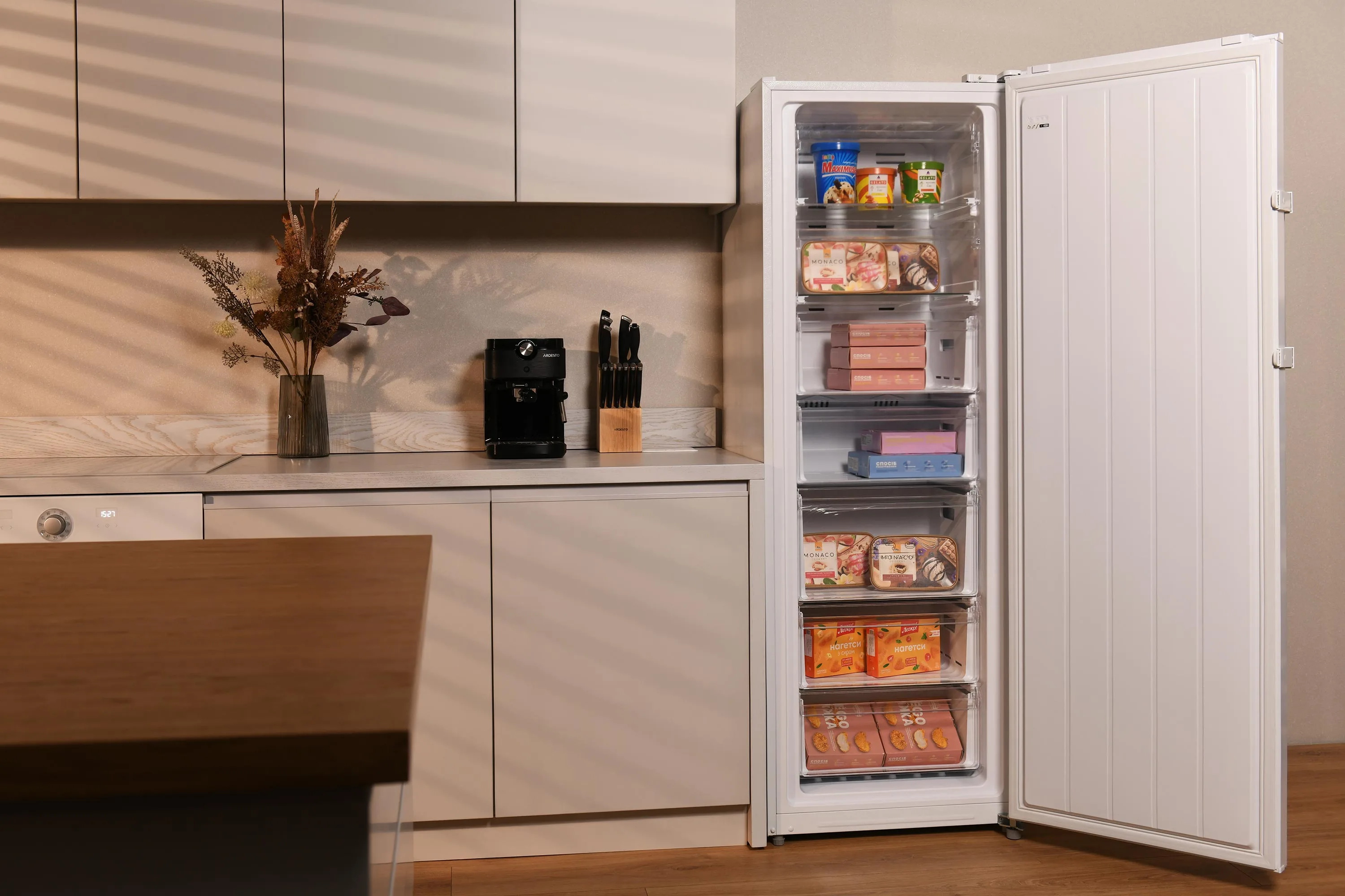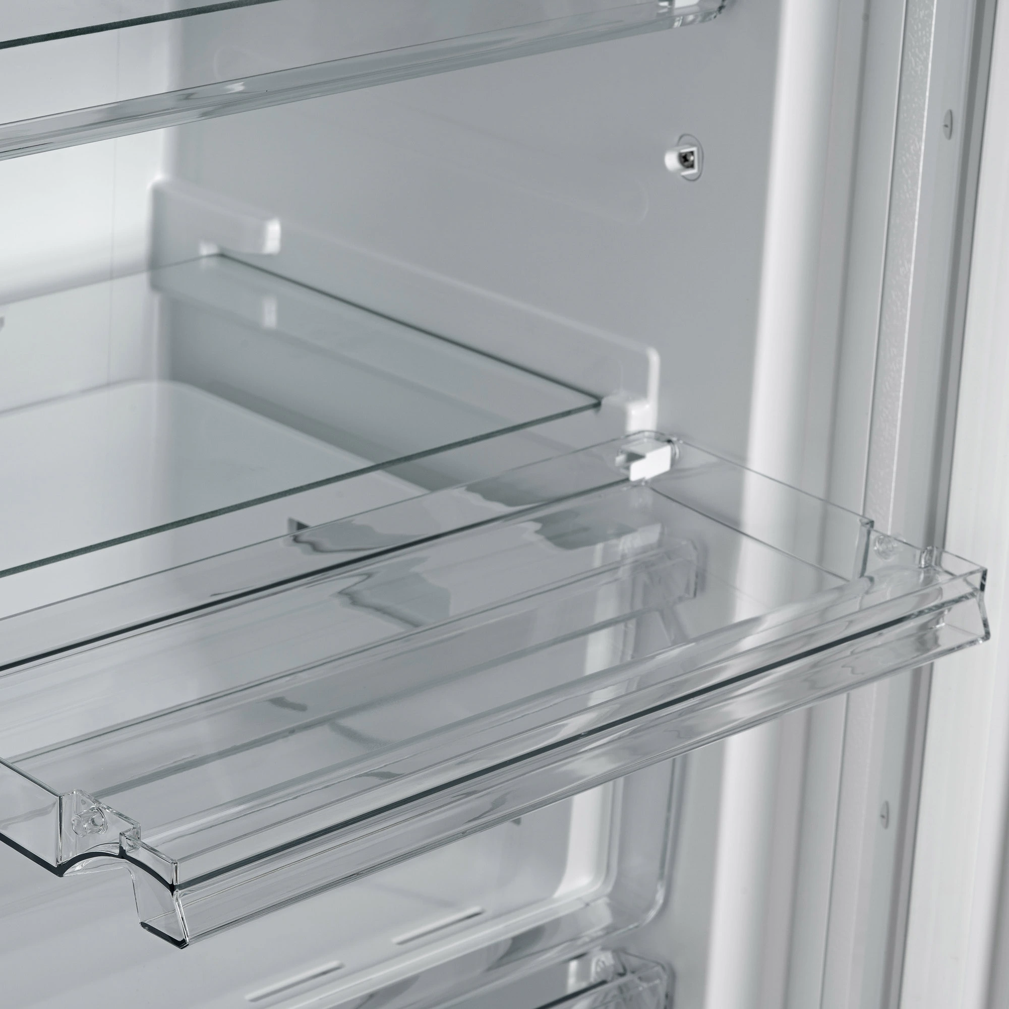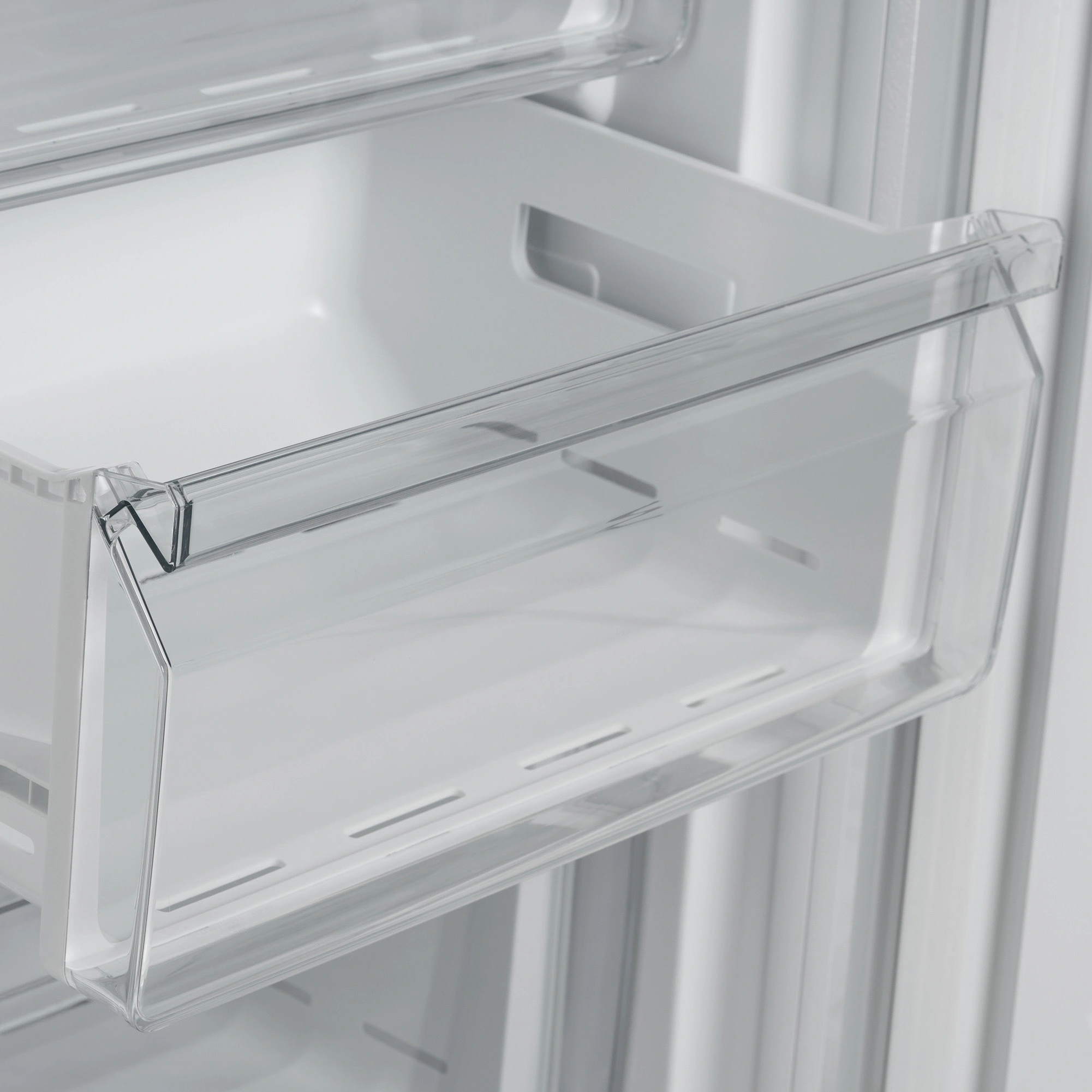 Містка вертикальна морозильна камера білого кольору з No Frost-охолодженням та можливістю роботи у режимі холодильника для домогосподарств та великих магазинів. Енергозбереження відповідає класу А+, для зберігання продуктів передбачено сім відсіків, а корисний об’єм складає 238 л.