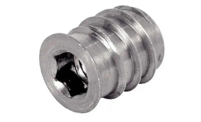 Муфта для вгвинчування, без обідка, виготовлена зі сталі. Параметри муфти (мм): внутрішня різьба-М4, діаметр зовнішньої різьби-8, діаметр стержня-6, діаметр голівки- 8, привід- внутрішній шестигранник SW4, довжина - 10 мм.