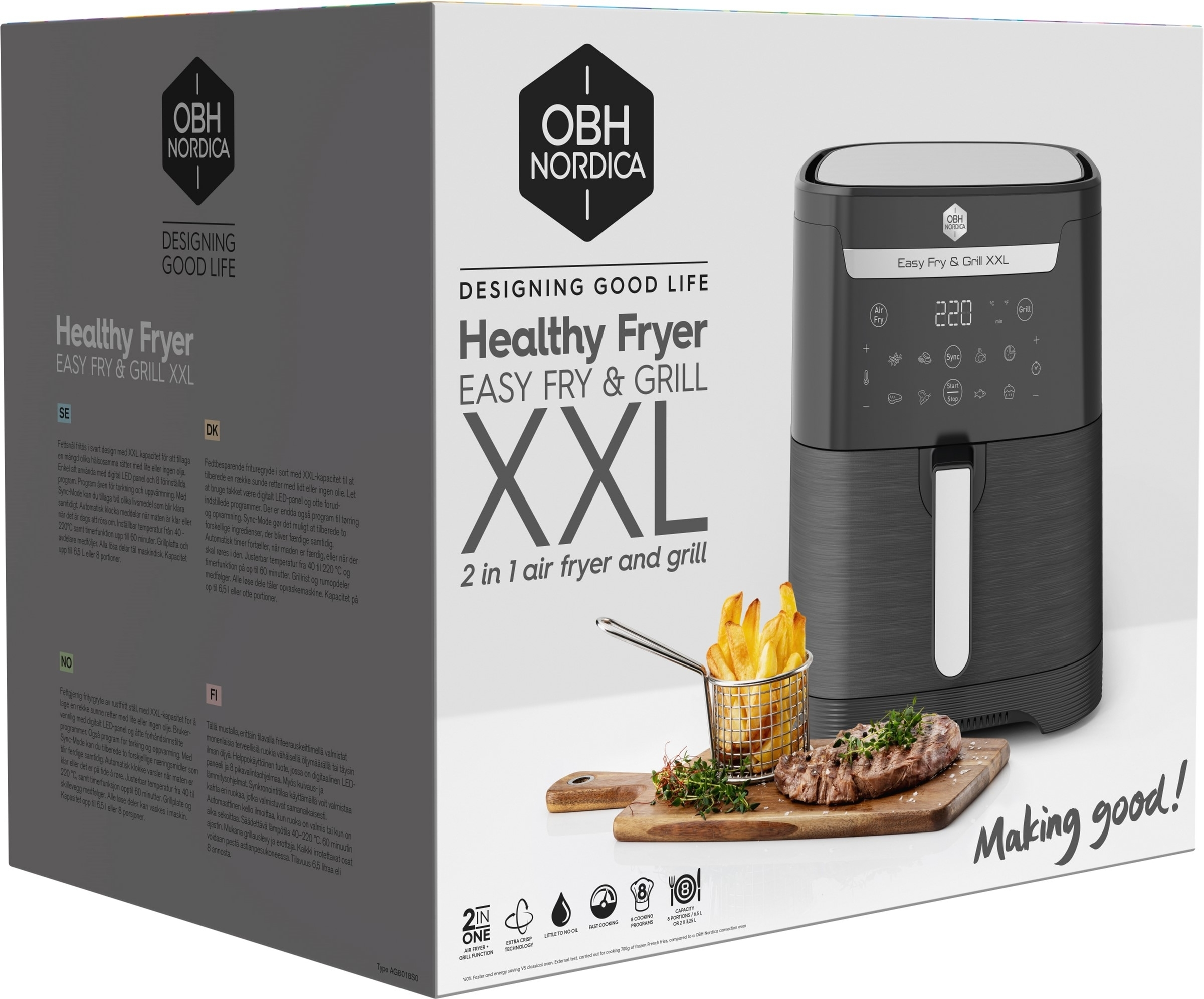 Мультипіч OBH Nordica Easy Fry & Grill XXL потужністю 1830 Вт — ідеальне рішення для великої родини. Завдяки об’єму чаші 6,5 л та температурному діапазону 40–200°C, вона дозволяє готувати різноманітні страви без олії. Сенсорне керування забезпечує зручність використання. Стильний чорний пластиковий корпус доповнює будь-який сучасний інтер’єр.