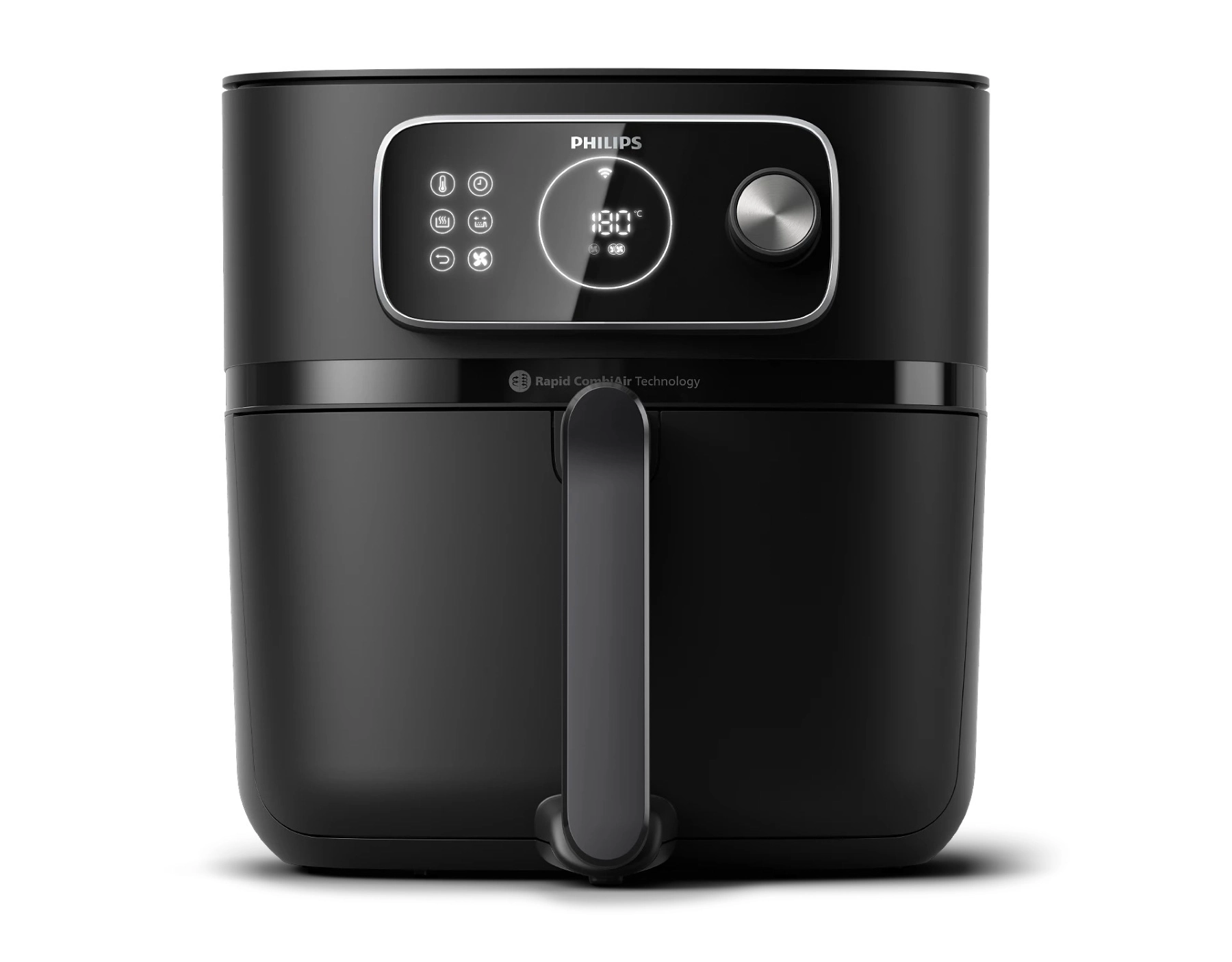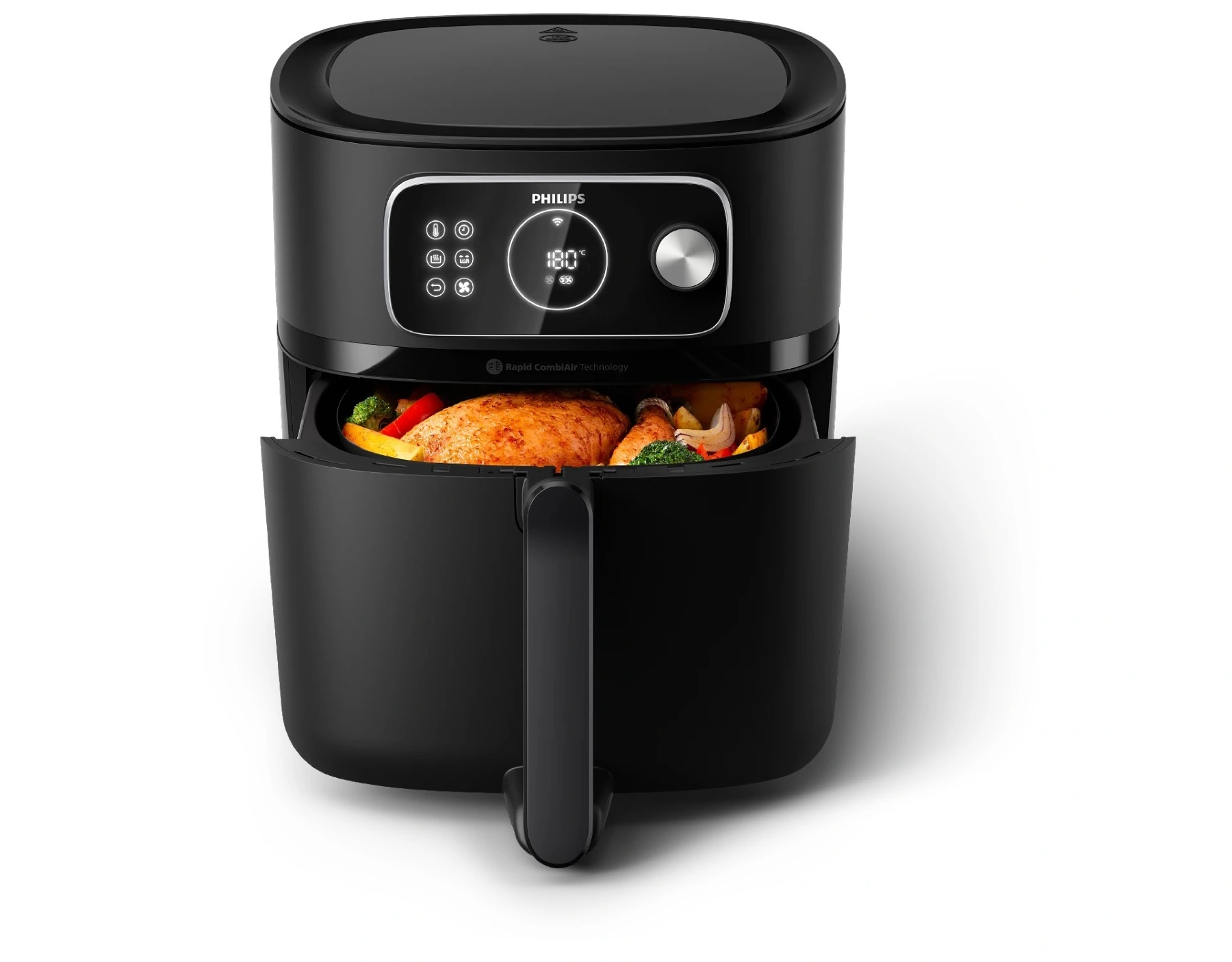 Мультипіч Philips HD9876/90 - це потужний кухонний помічник з великою ємністю кошика 8,3 л та 22 функціями приготування для всіх страв. Готуйте з упевненістю — від хрусткої картоплі фрі та ніжних курячих крилець до хрустких овочевих чіпсів та вишуканих десертів. Ця мультипіч робить усе: смажить, готує на грилі, запікає, пече, тушкує, готує як мультиварка, смажить на вогні, висушує, розморожує тощо. Запатентована технологія Rapid CombiAir для додаткового смаку та різноманітності. Розкрийте справжній потенціал свого дому за допомогою HomeID. Знайдіть натхнення для приготування їжі та кави з понад 500 рецептами й порадами для вашого дому.