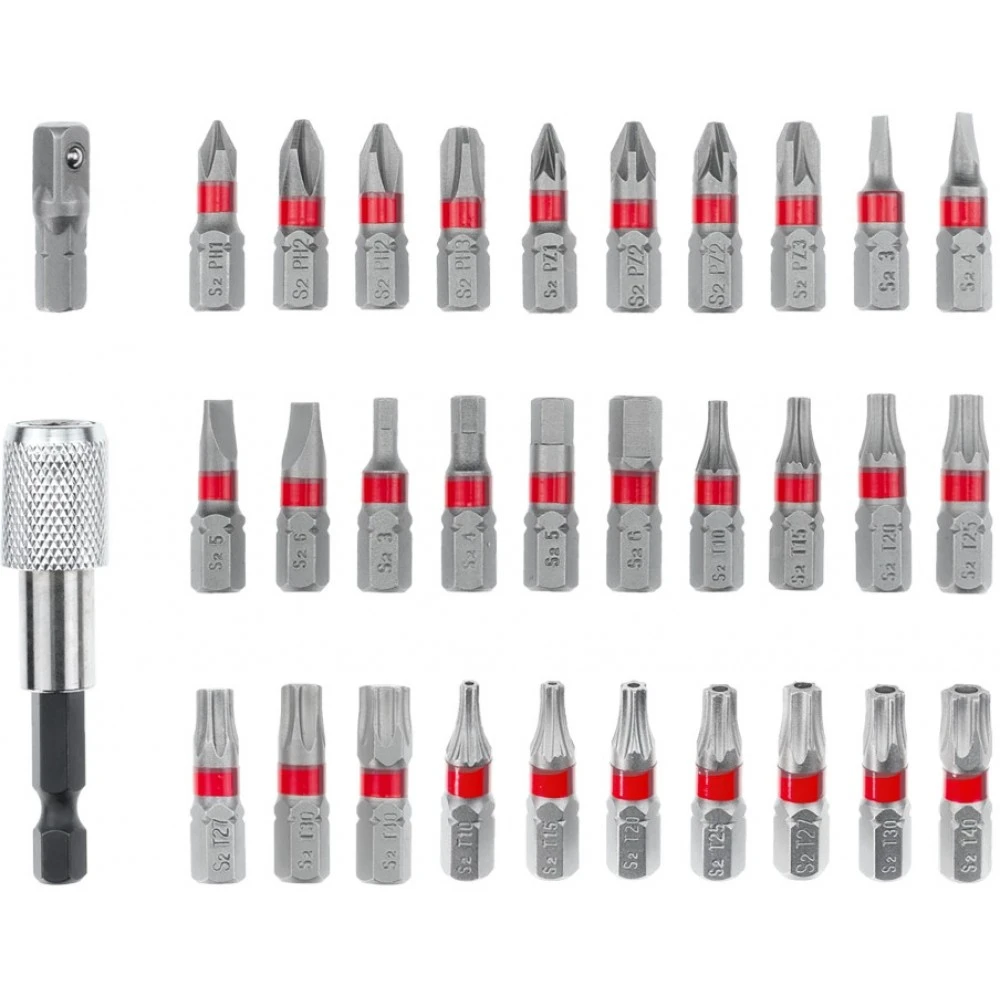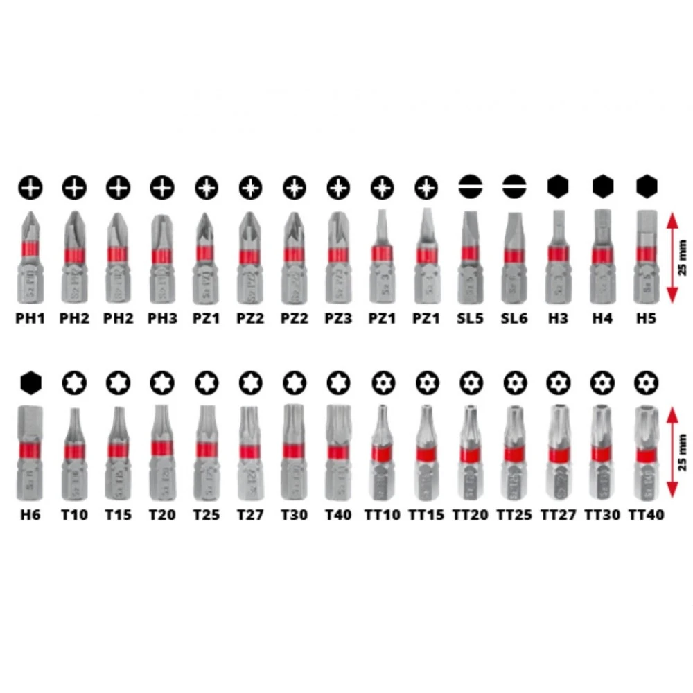 Висока якість бренду KWB, що належить Einhell 30 біт (25 мм) з хвостовиком C 6.3, з піскоструминної сталі S2 сірого кольору PH1 / PH2 / PH2 / PH3 / PZ1 / PZ2 / PZ2 / PZ3 / SL3 / SL4 / SL5 / SL6 / H3 / H4 / H5 / H6 / T10 / T15 / T20 / T25 / T27 / T30 / T40 / TT10 / TT15 / TT20 / TT25 / TT27 / TT30 / TT40. 1 швидкозмінний тримач насадок (60 мм) з металевою втулкою, з вуглецевої сталі з хвостовиком E 6.3. 1 перехідний шестигранник до приводу 1/4", виготовлений із міцної CV-сталі, матове покриття. Практичний кейс для організованого зберігання.