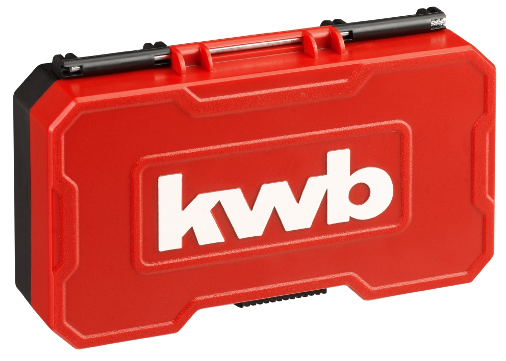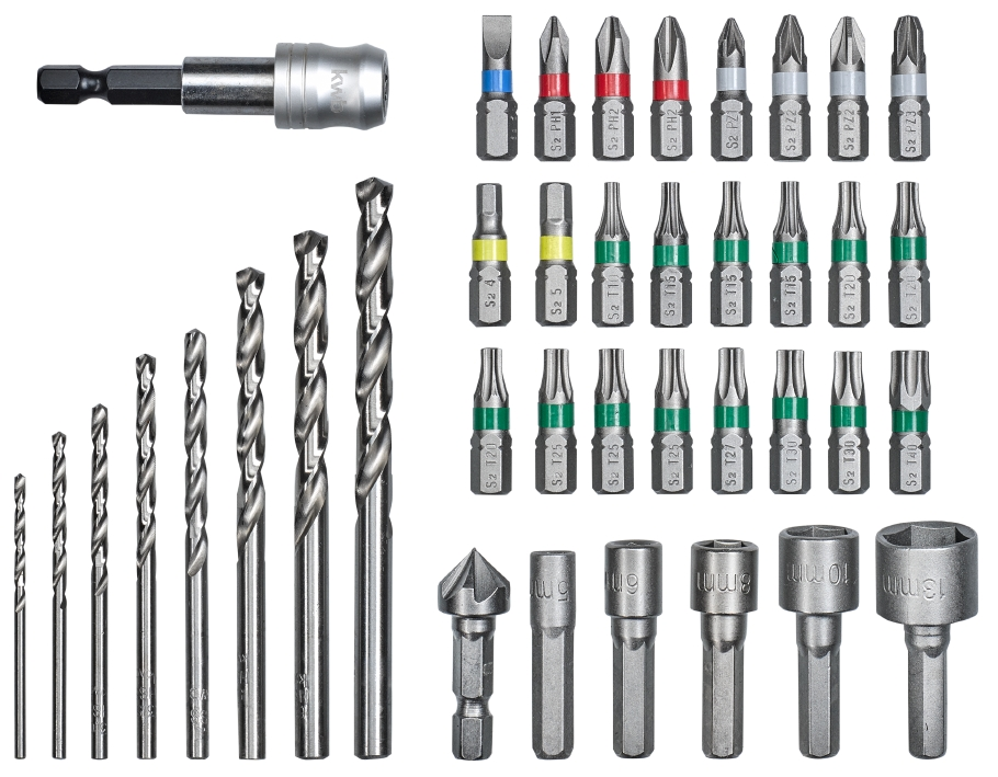 Набір приладдя KWB 39 шт (L-Box): біти PH/PZ/SL/T/HEX, свердла по металу HSS Ø2–6,5 мм (вістря 135°, хвостовик E6.3), гайкові насадки (nut setters) та зенковки. Постачається у зручному пластиковому кейсі. Підходить для шуруповертів і дрилів.