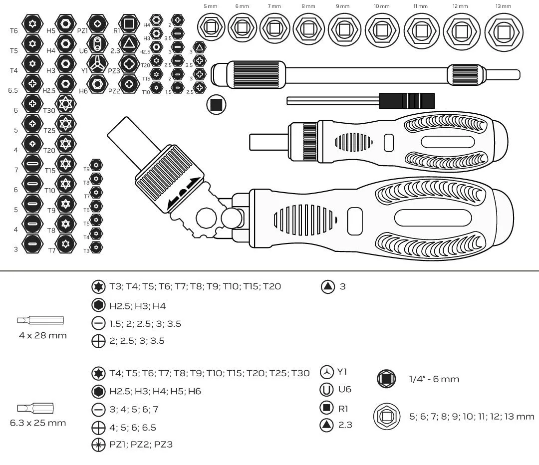 - Комплектация головки торцеві; Біти; шарнірно-губцевий інструмен