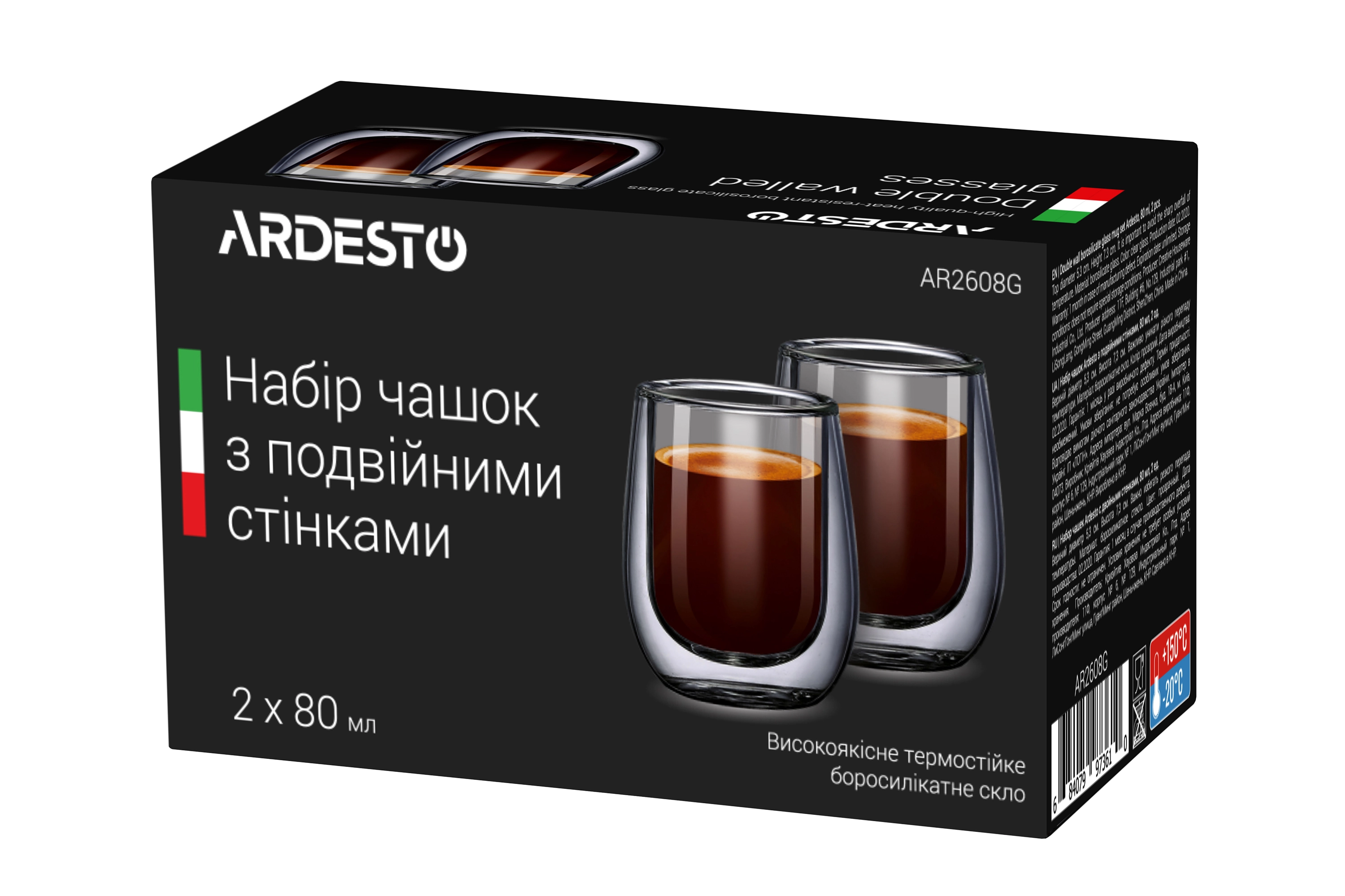 Набір чашок з подвійними стінками для еспресо Ardesto, 80мл, 7.3см, 2шт, боросилікатне скло, прозори