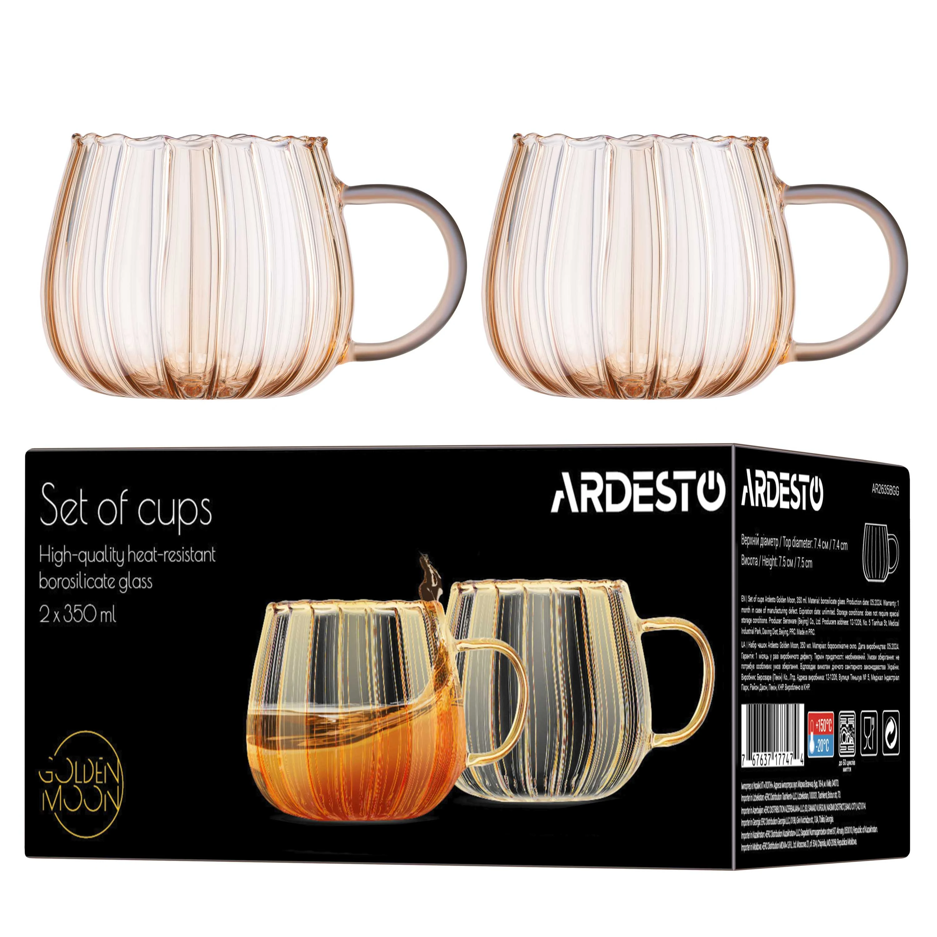 Набір чашок ARDESTO Golden Moon – втілення елегантності в кожній деталі! У комплекті є дві чашки, які виготовлено з якісного боросилікатного скла, що вирізняється міцністю і термостійкістю від -20 до +150 °C. Прозорий і мінімалістський дизайн золотавого відтінку підкреслює сучасний вигляд, роблячи вироби окрасою сервірування будь-якого стилю. Об’єм кожної чашки становить 350 мл за висоти 7,5 см і діаметра 7,4 см. Важливо: вироби не рекомендовано використовувати в мікрохвильовій печі чи мити в посудомийній машині.