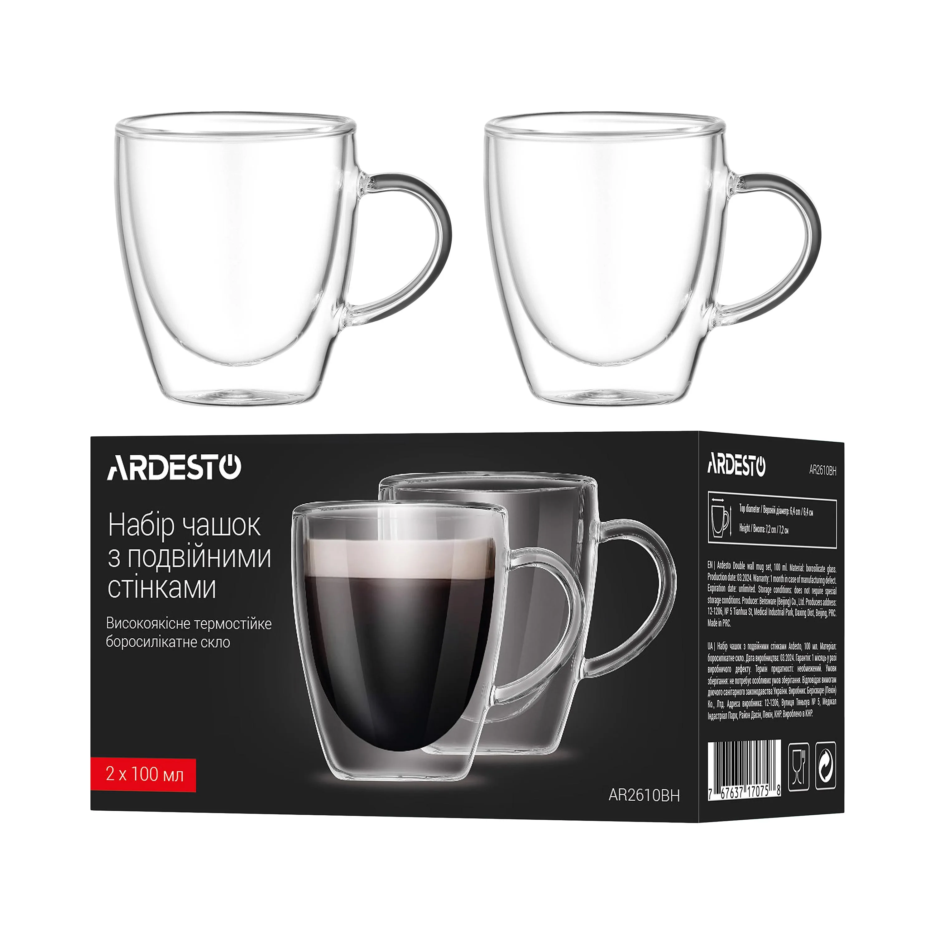 Набір чашок з ручками і подвійними стінками Ardesto, 100мл, 2шт, боросилікатне скло, прозорий