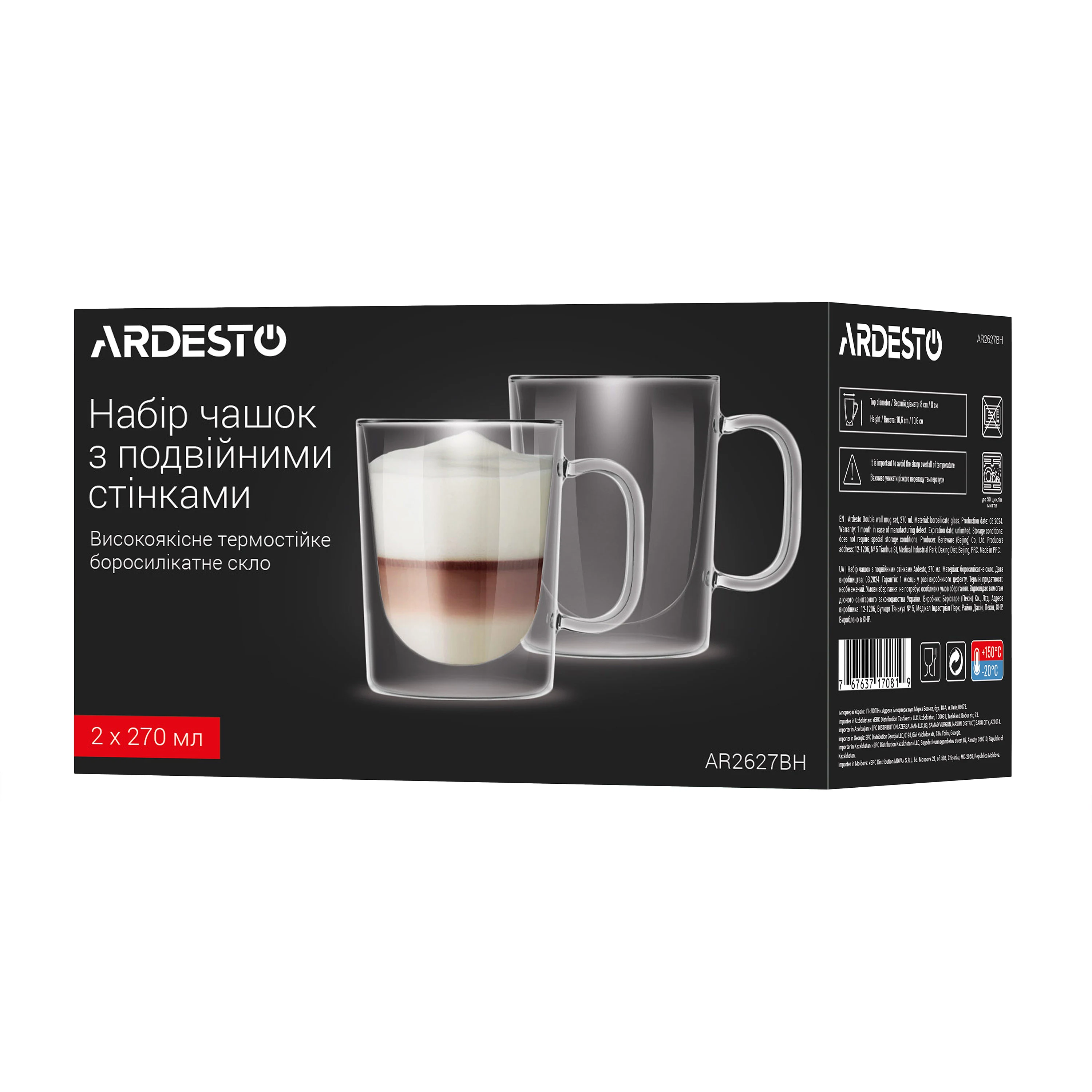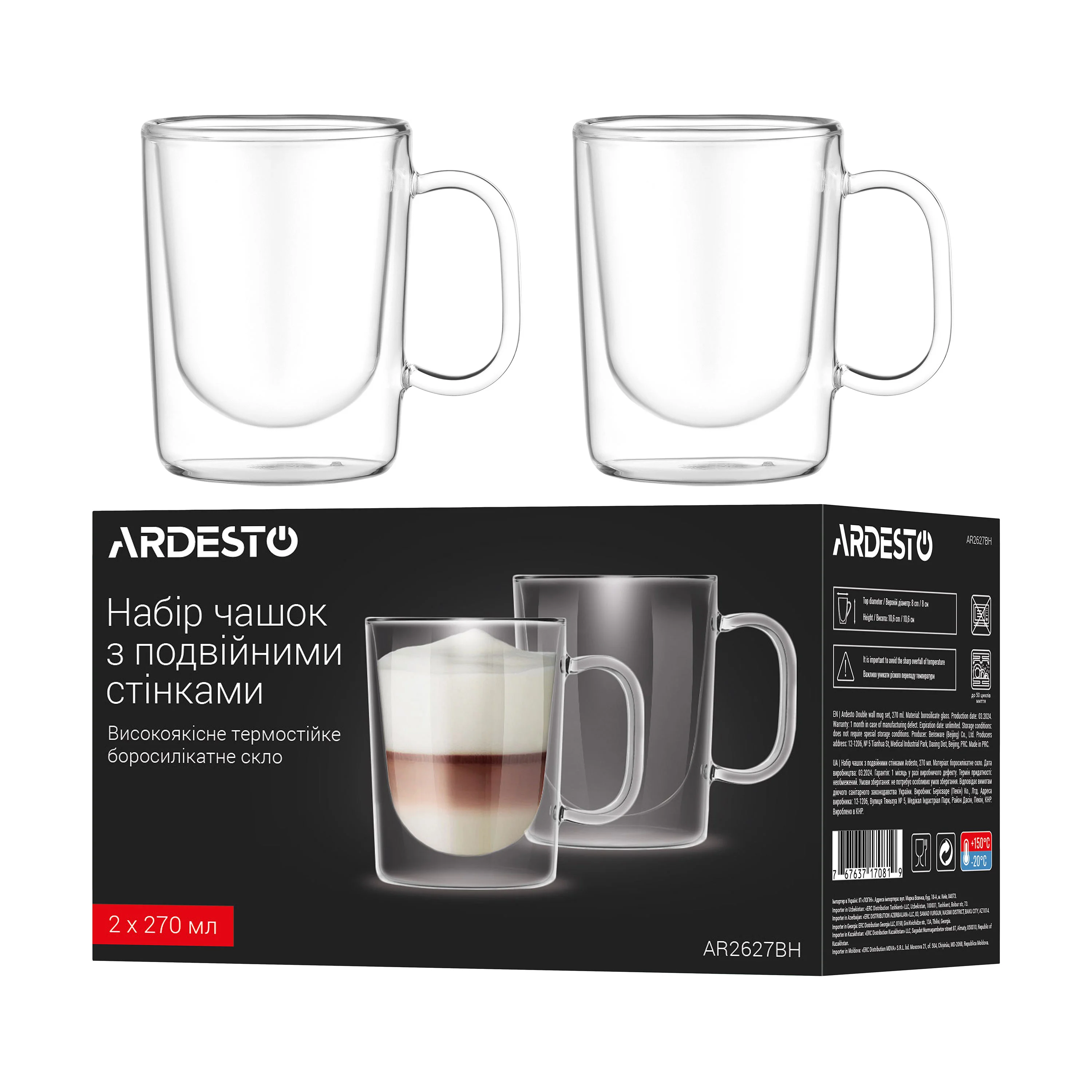 Набір чашок з ручками і подвійними стінками Ardesto, 270мл, 2шт, боросилікатне скло, прозорий