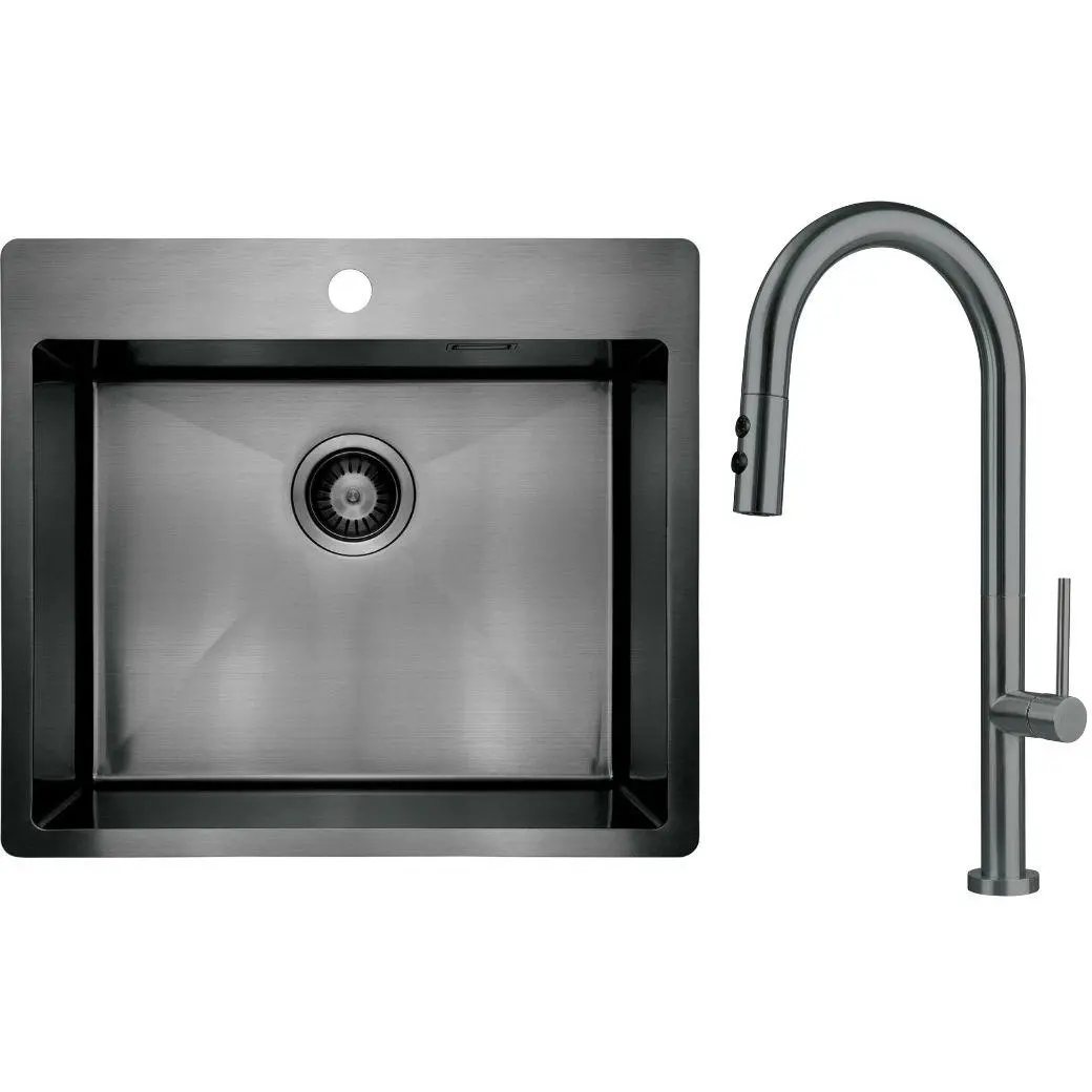 Сучасний кухонний набір серії Olfato поєднує практичність і стильний дизайн. Мийка виготовлена з нержавіючої сталі з брашованою обробкою в кольорі титан. У комплект входить компактний сифон Space-Saver із можливістю підключення посудомийної машини. Змішувач оснащений висувним носиком із двома режимами струменя, зручним керуванням та довговічним керамічним картриджем. Завдяки елегантному кольору титан, набір стане стильним доповненням будь-якої кухні.