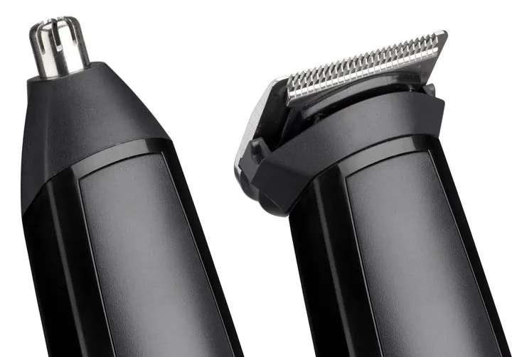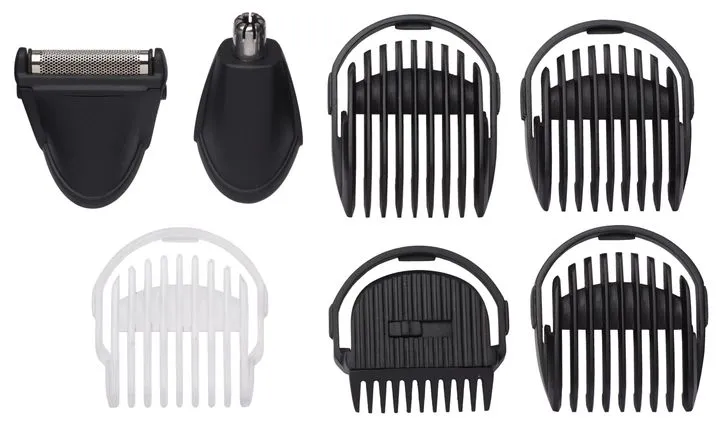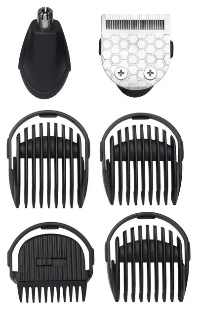 Прибор оснащён вибрационным мотором и прочными лезвиями из нержавеющей стали с функцией самозатачивания. 6 насадок позволяют выполнять как точную стрижку, так и гигиеническую обработку. В комплект входят насадки-гребни, точный триммер и триммер для носа/ушей.