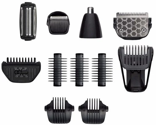 Модель включает 11 насадок для различных зон: регулируемые гребни для бороды и волос, насадки для носа и ушей, точный и телесный триммер. Эргономичный корпус и стильный дизайн роблять прибор зручним у щоденному використанні.