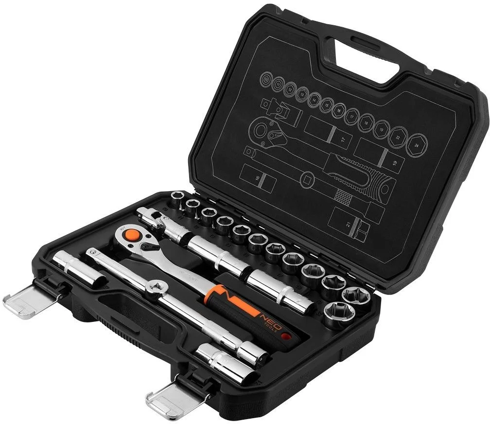 Набір торцевих ключів 1/2" NEO складається з 20 елементів, виготовлених із високоякісної хромванадієвої сталі. До складу набору входить тріскотка, що характеризується западковим (храповим) механізмом (90 зубці) із подовженим ресурсом. Набір містить багатий вибір насадок (розмірами від 10 до 24 мм).