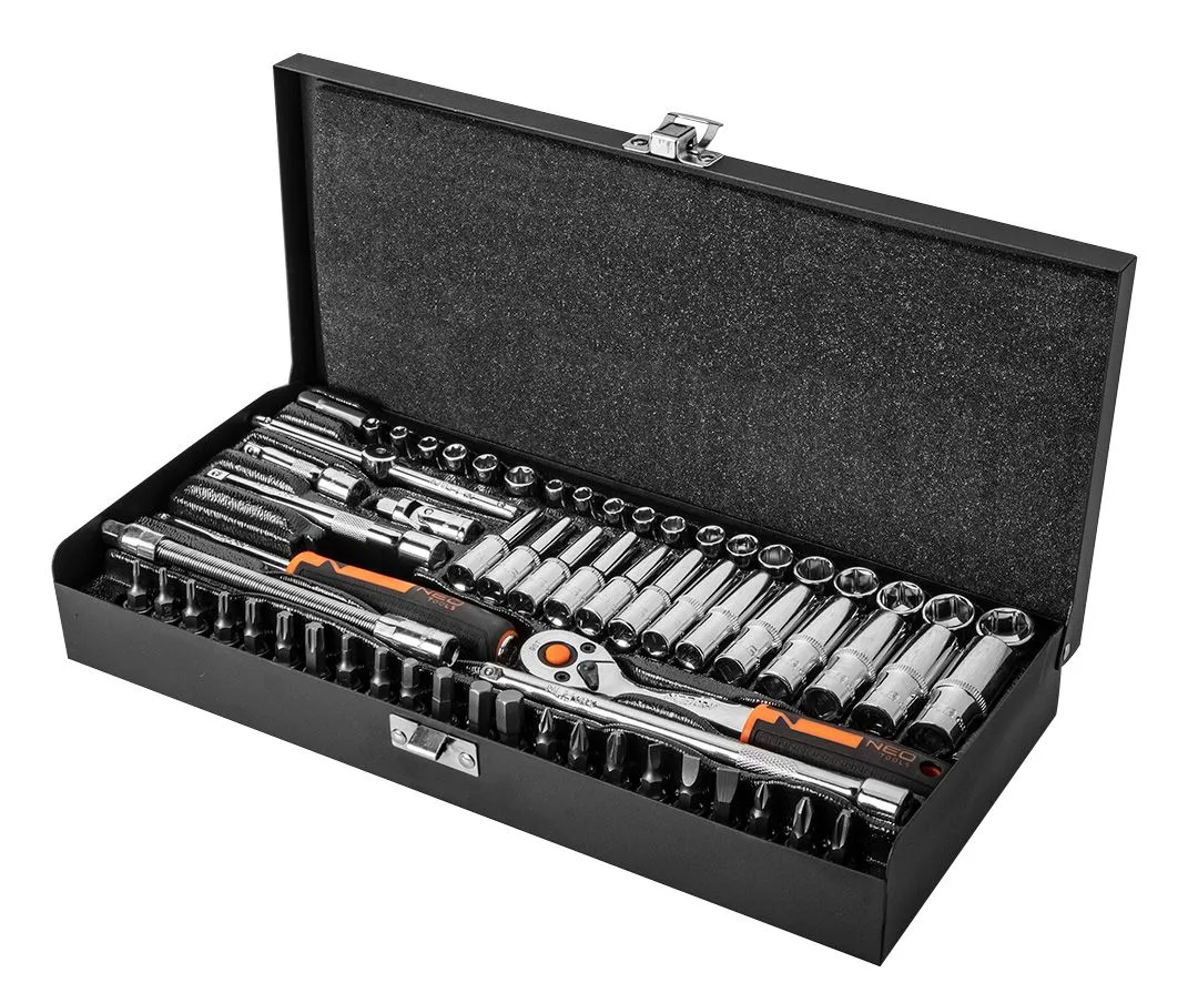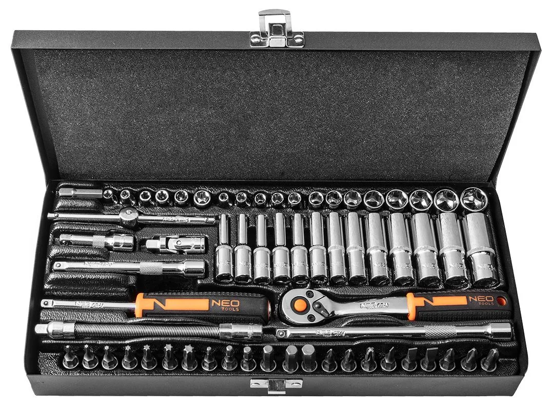 Набір інструментів Neo Tools, набір торцевих головок, 63шт, 1/4", CrV, металевий кейс