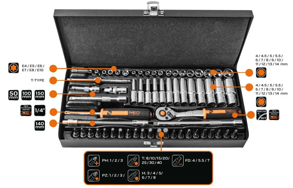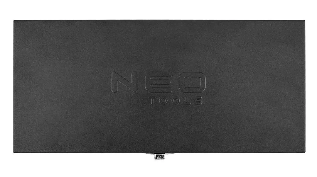Набір накидних ключів NEO (арт. 10-008) ― це повний комплект інструментів розміром ¼”, укладених у міцній і зручній металевій валізі з витисненим логотипом. До його складу входять 63 елементи, виготовлені з високоякісної хром-ванадієвої сталі. Набір містить багатий комплект шестигранних насадок розмірами від 4 до 14 мм. У комплекті представлені насадки двох видів: короткі та довгі, ― завдяки чому існує можливість ідеального допасування інструмента до вигвинчуваного елемента.