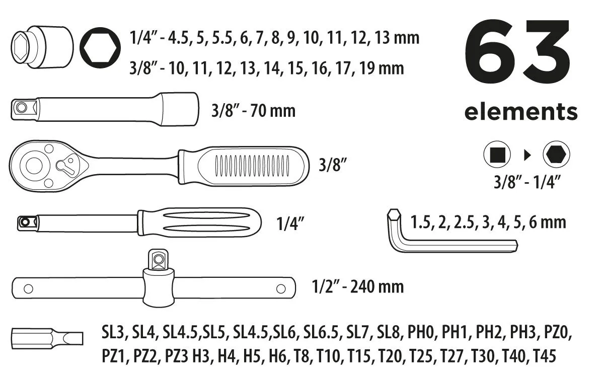 Набір торцевих ключів Top Tools 3/8" (38D515) з набором викруток, шестигранних ключів та аксесуарів.