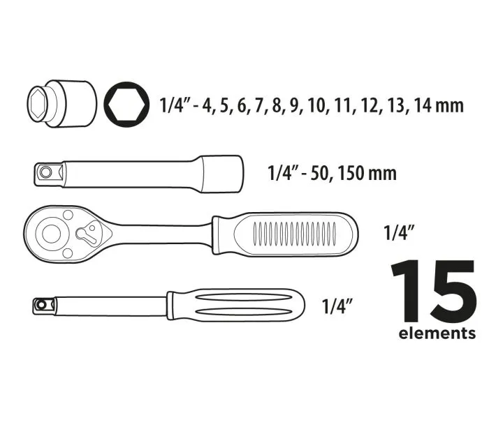Набір торцевих ключів 1/4" (38D525) з 15 предметів включає набір шестигранних торцевих головок 1/4" з храповиком і рукояткою викрутки. Все це розміщено в практичному пластиковому кейсі.