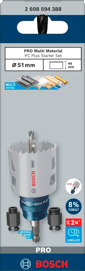 Bosch Professional Multi Material Power Change Plus — стартовий набір коронок 51 мм (5 шт), розроблений для роботи з різними матеріалами. Забезпечує точне свердління, довговічність та зручну заміну завдяки системі Power Change Plus.
