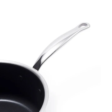 Щоб ці ковші GreenPan виглядали як нові, вони мають покриття Evershine, яке захищає їх від зміни кольору при нагріванні. Обгорнуті обідки для оптимального захисту від ударів і силуетні заклепки для внутрішнього простору без зачіпок доповнюють список вражаючих функцій цих ковшів Premiere.